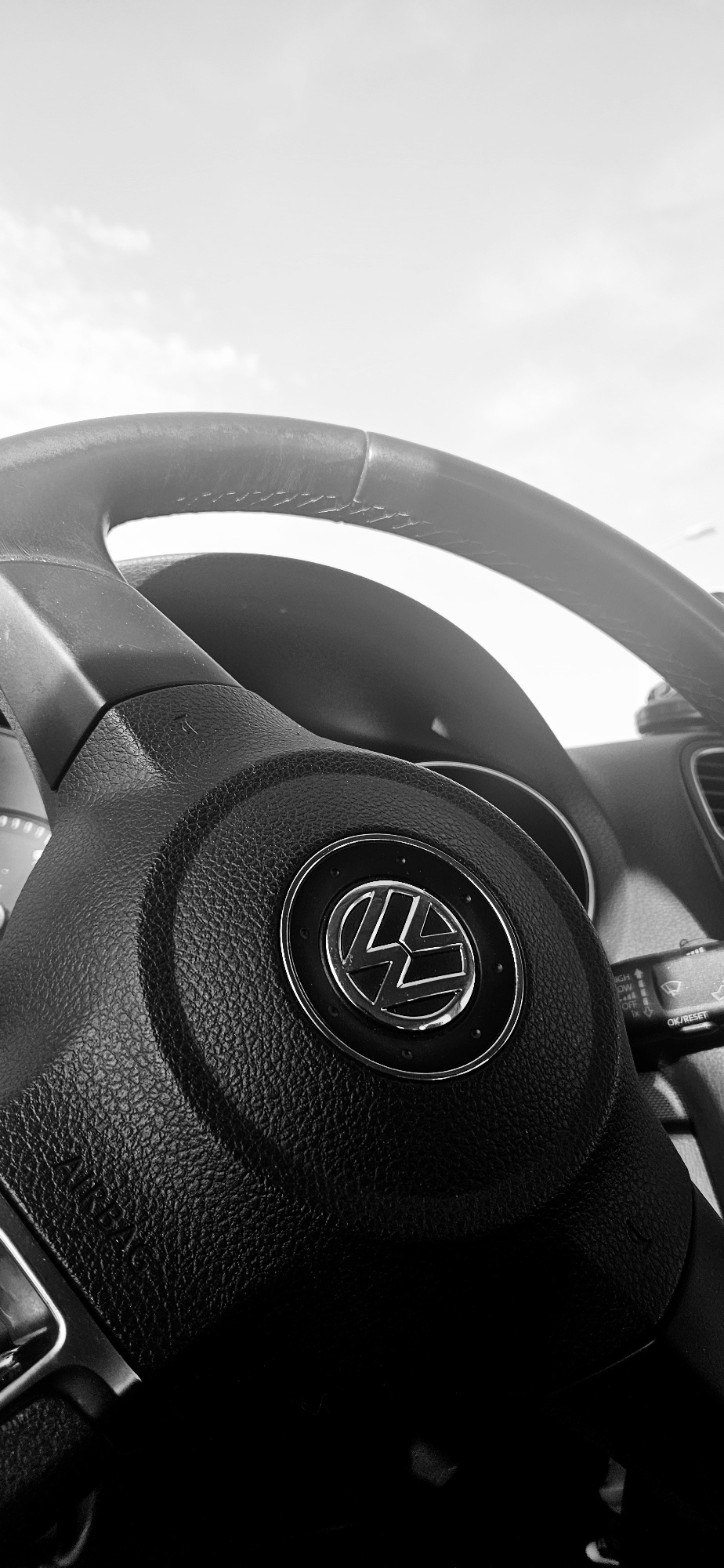 This black and white image captures a close-up, low-angle view of the interior of a car, specifically focusing on the steering wheel. The steering wheel, made of textured black material, occupies the…read more