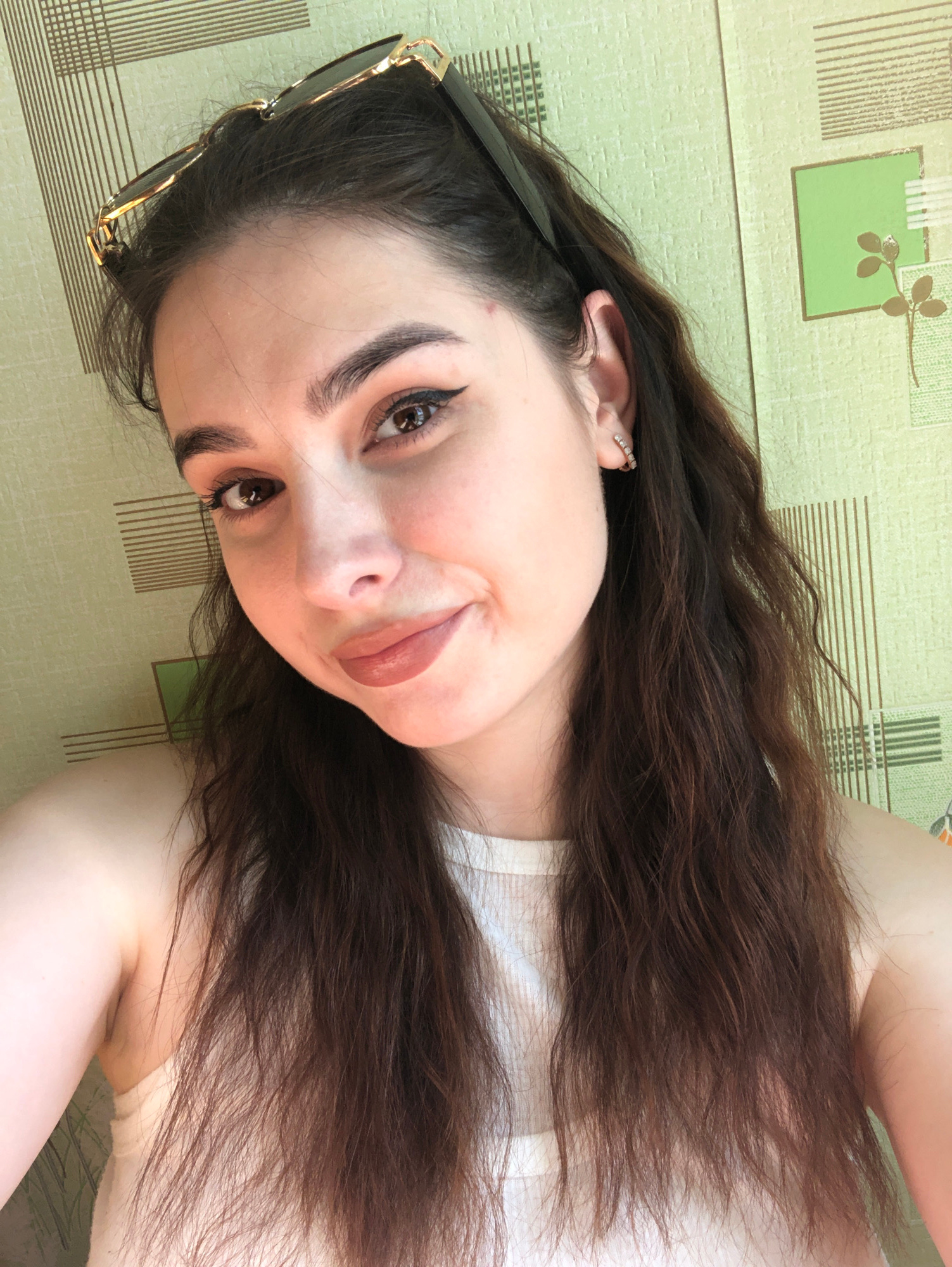 A young woman with long, dark brown hair and light skin poses indoors. She is wearing a white top and has sunglasses perched on her head. Her makeup includes eyeliner and lip color. She has a piercing…read more