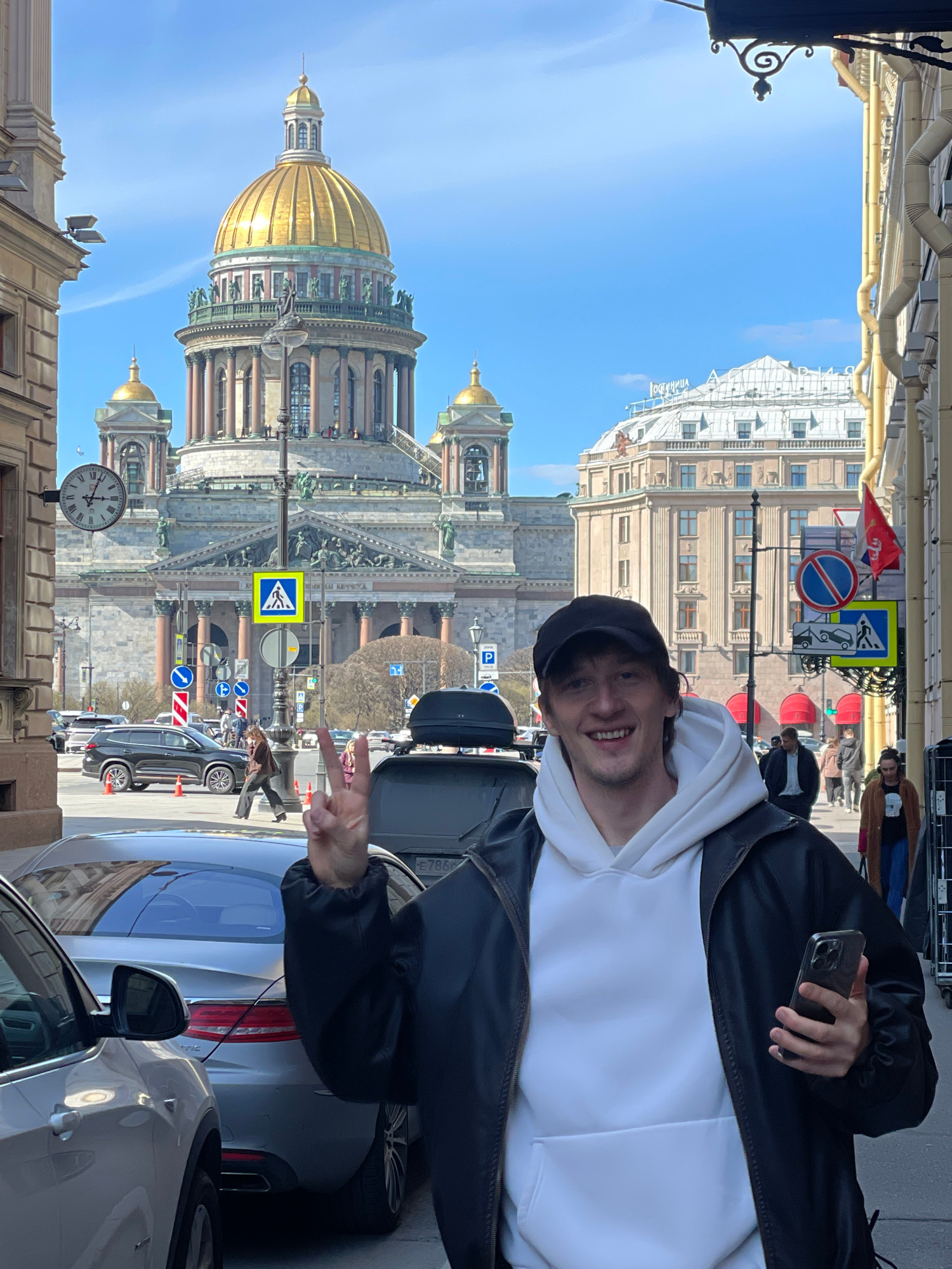The image captures a vibrant street scene in Saint Petersburg, Russia, on a clear, sunny day. The main subject, a young man, is prominently featured in the foreground, smiling widely and making a peac…read more
