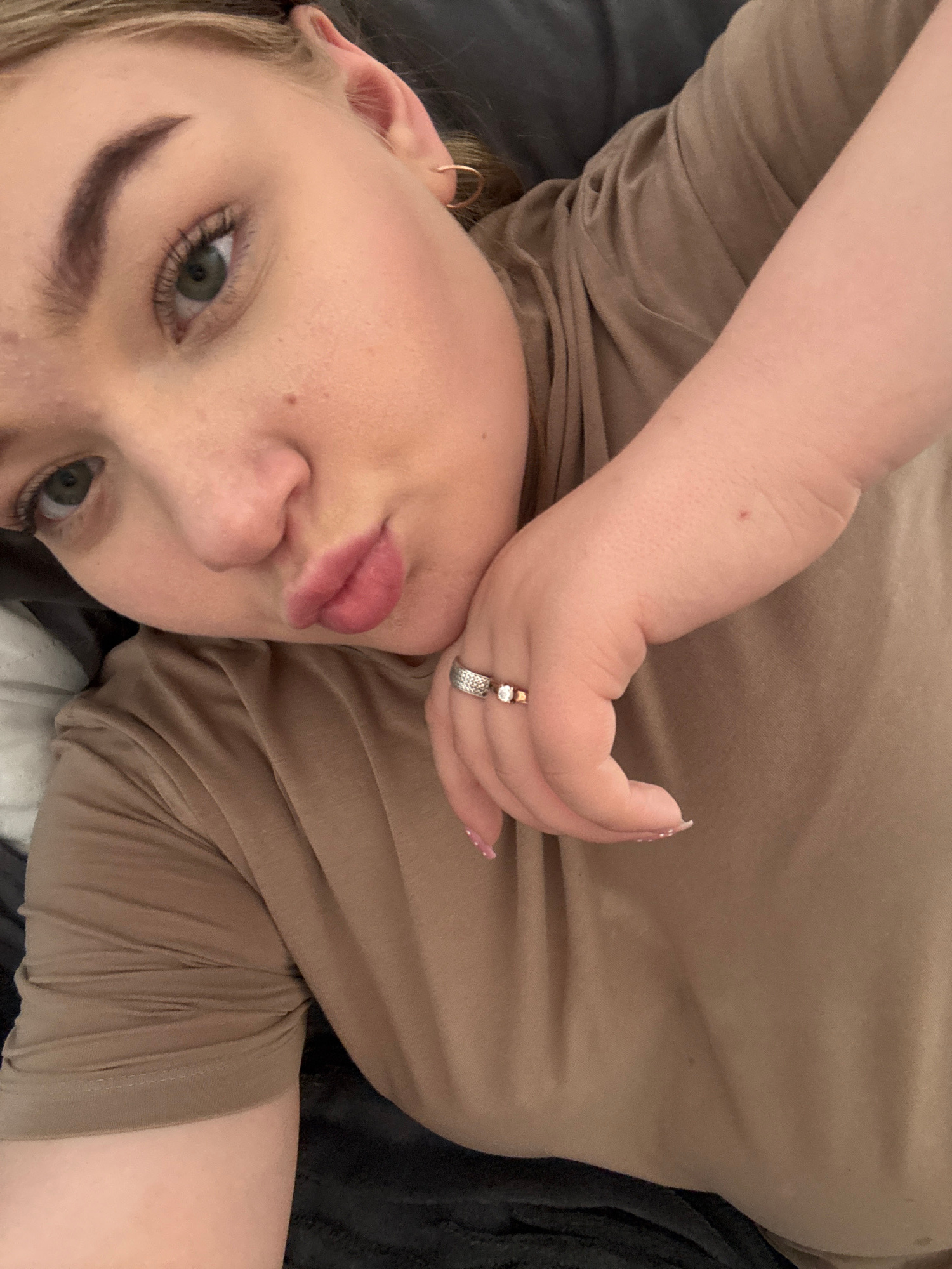 A woman is lying down, likely indoors, wearing a brown shirt and a silver ring. Her left hand is near her face. The background consists of a dark surface. The location is unknown but presumed to be Ch…read more
