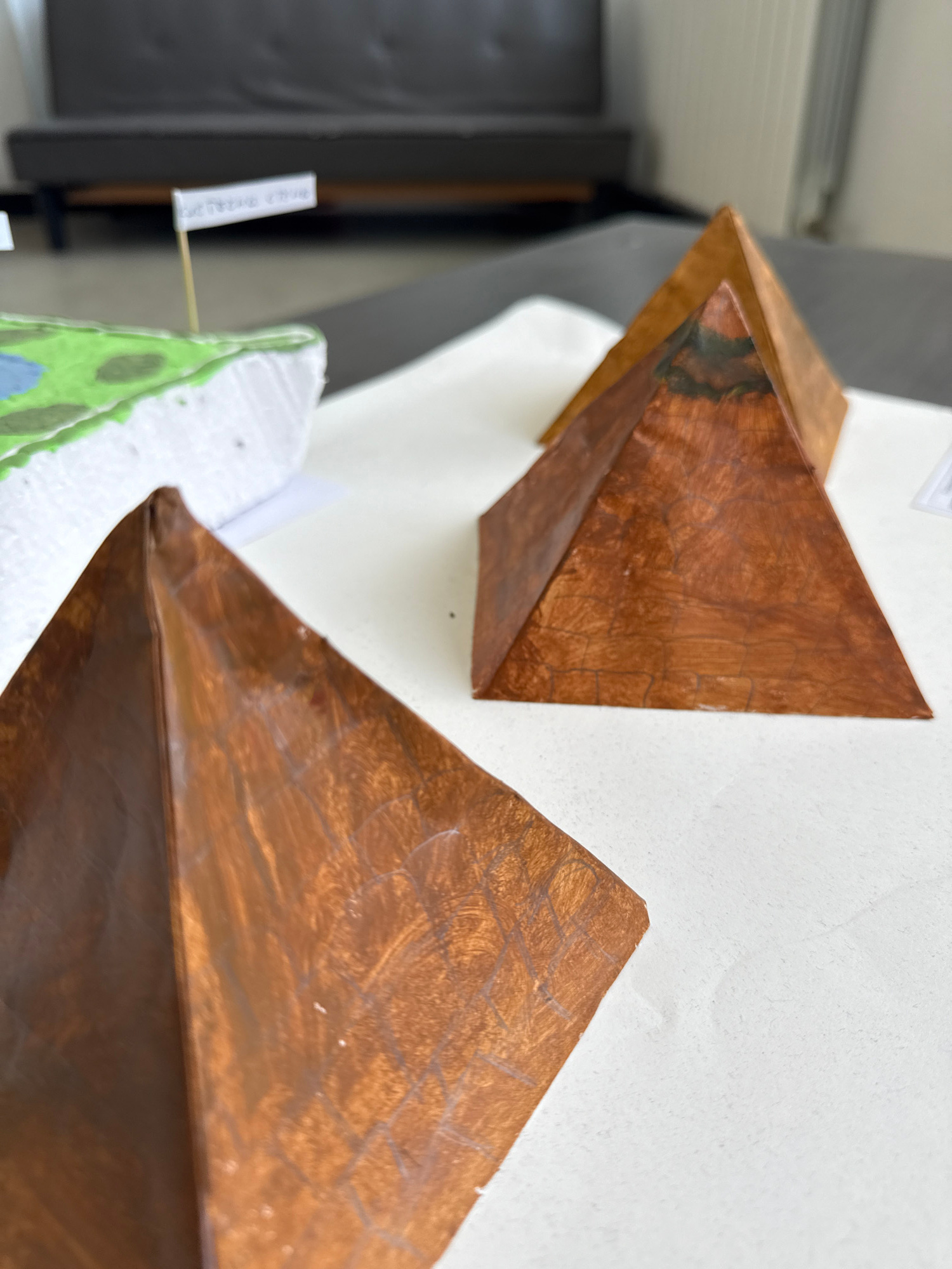 The image displays an indoor scene featuring several geometric models arranged on a white surface, possibly a table or display board. Three prominent pyramid-like or prism-like shapes, likely construc…read more