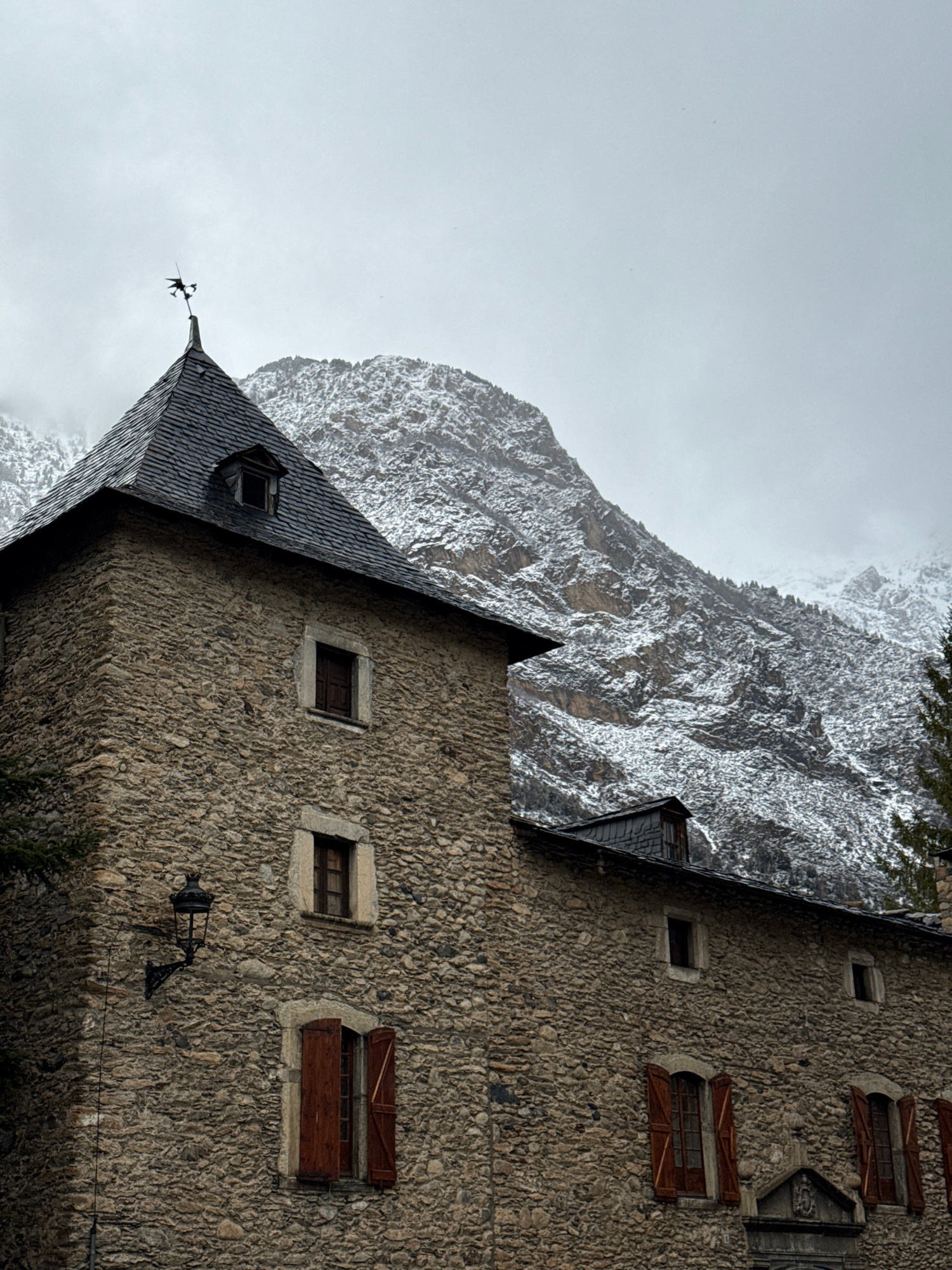 The image shows a close-up of a stone building with a dark slate roof and several windows with wooden shutters. The building is located in Benasque, Spain. A snow-covered mountain range is visible in…read more