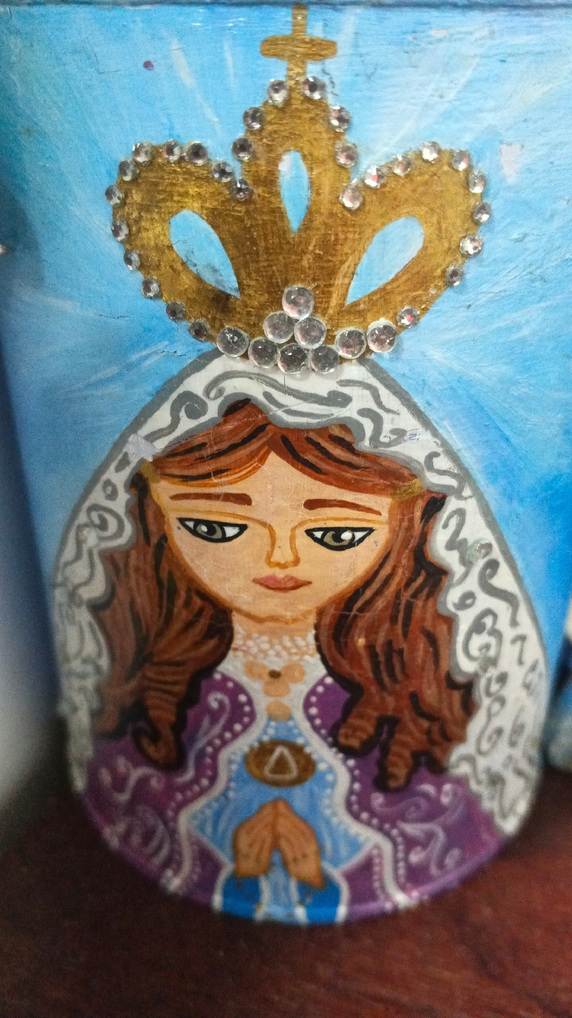 A close-up, eye-level shot captures a vibrant, stylized depiction of a female figure, characteristic of folk or devotional art, likely from Juan Griego, Venezuela. The figure is shown from the chest u…read more