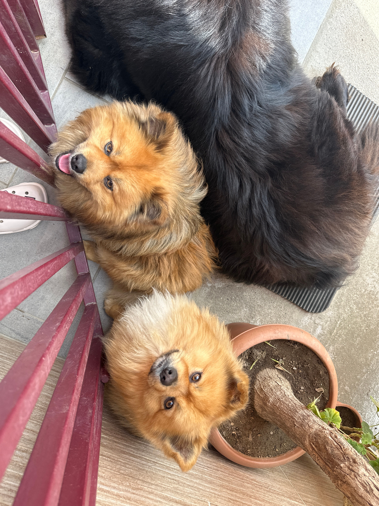 A high-angle, outdoor shot depicts three dogs, two of which are brown and tan Pomeranians. One Pomeranian is to the right, by a potted plant. The other Pomeranian is at the bottom left, near a red met…read more