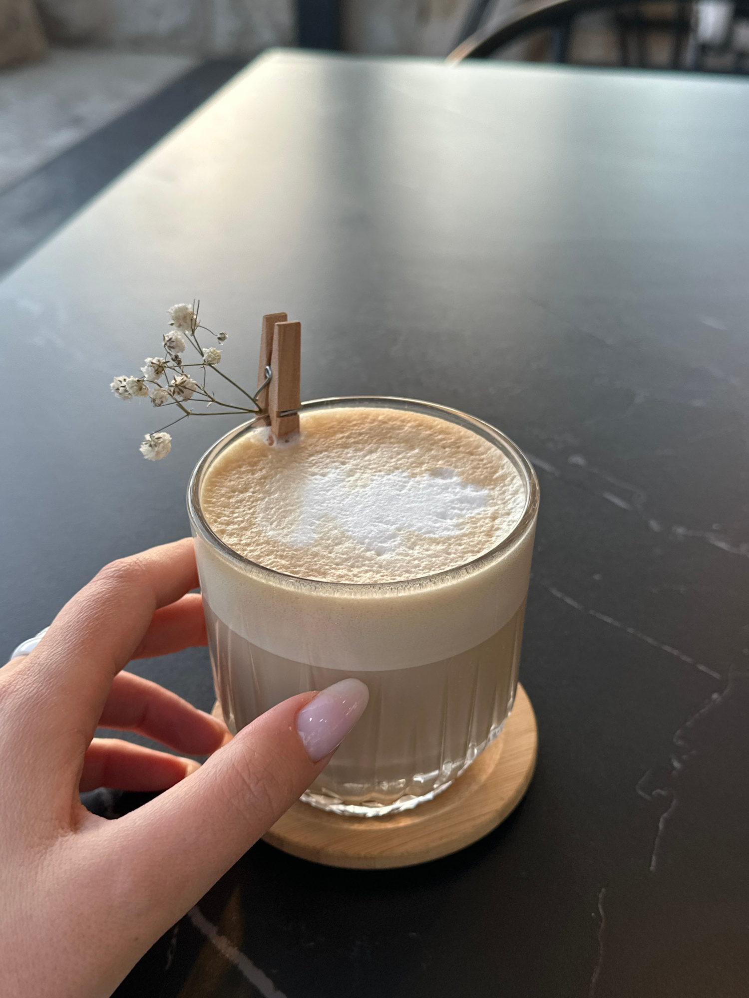 A latte or similar beverage is held in a ribbed glass on a wooden coaster by a hand with a polished almond-shaped nail. The glass has a small wooden clothespin clipped to it, holding sprigs of baby's…read more