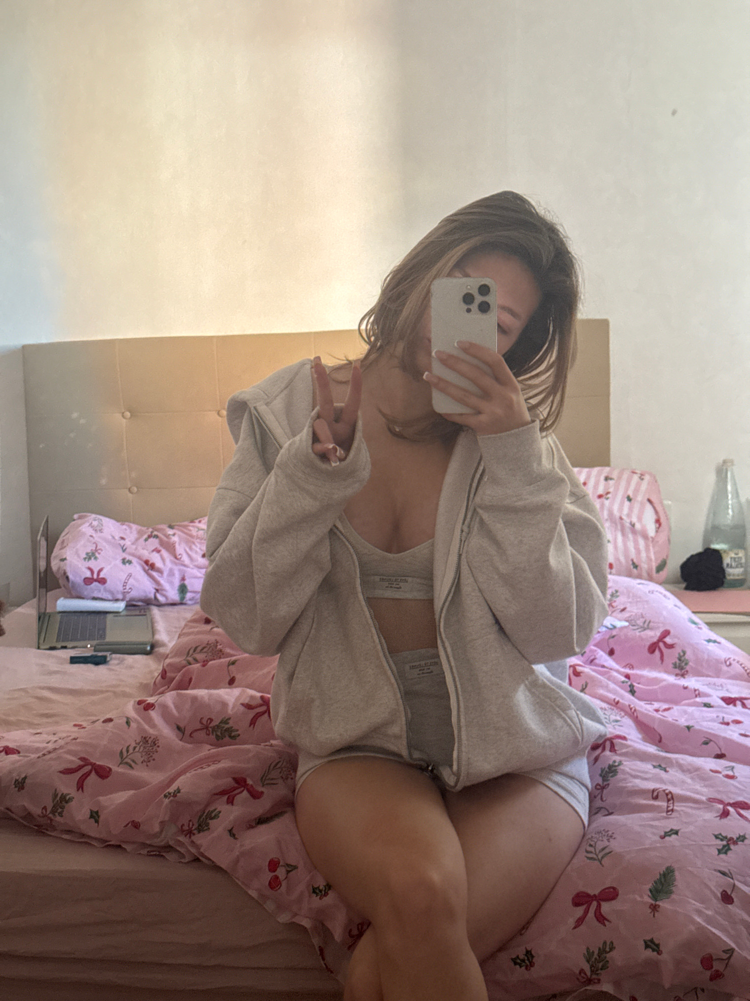 A young woman is reclining on a bed with pink Christmas-themed bedding, taking a selfie with a white iPhone. She is wearing a grey zipper hoodie over a grey undergarment and light-colored shorts. She…read more