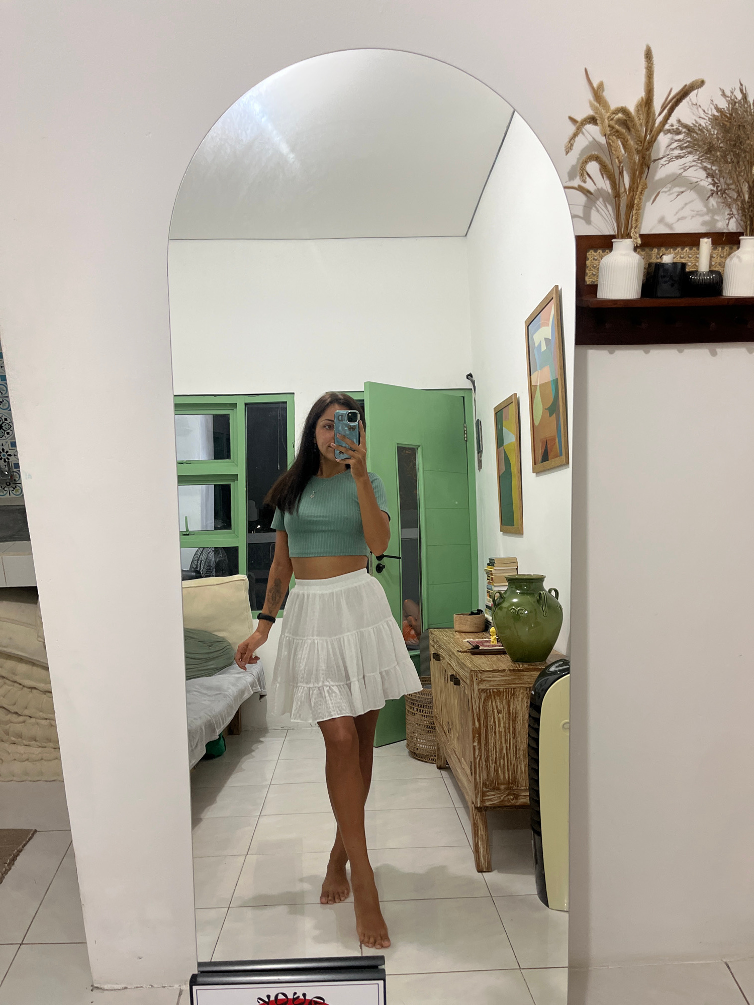 A full-body mirror selfie captures a young woman posing indoors in Kuta Selatan, Indonesia. The image is oriented sideways (rotated 90 degrees clockwise from vertical). The woman, with long dark hair,…read more