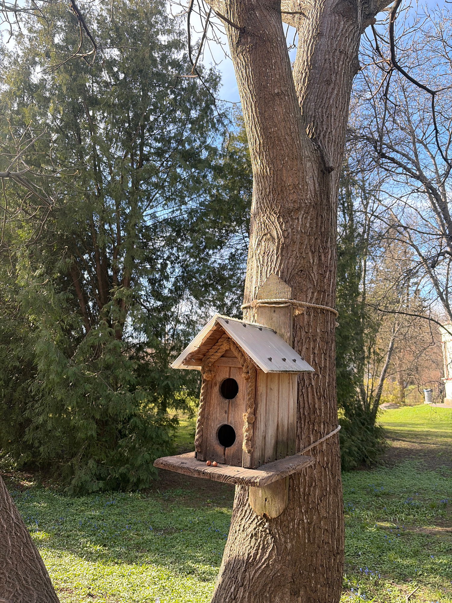 A close-up, daytime shot shows a wooden birdhouse affixed to a tree trunk in a grassy area. The birdhouse is made of light-colored wood with a gray roof and two round entrance holes. It is tied to theβ¦read more