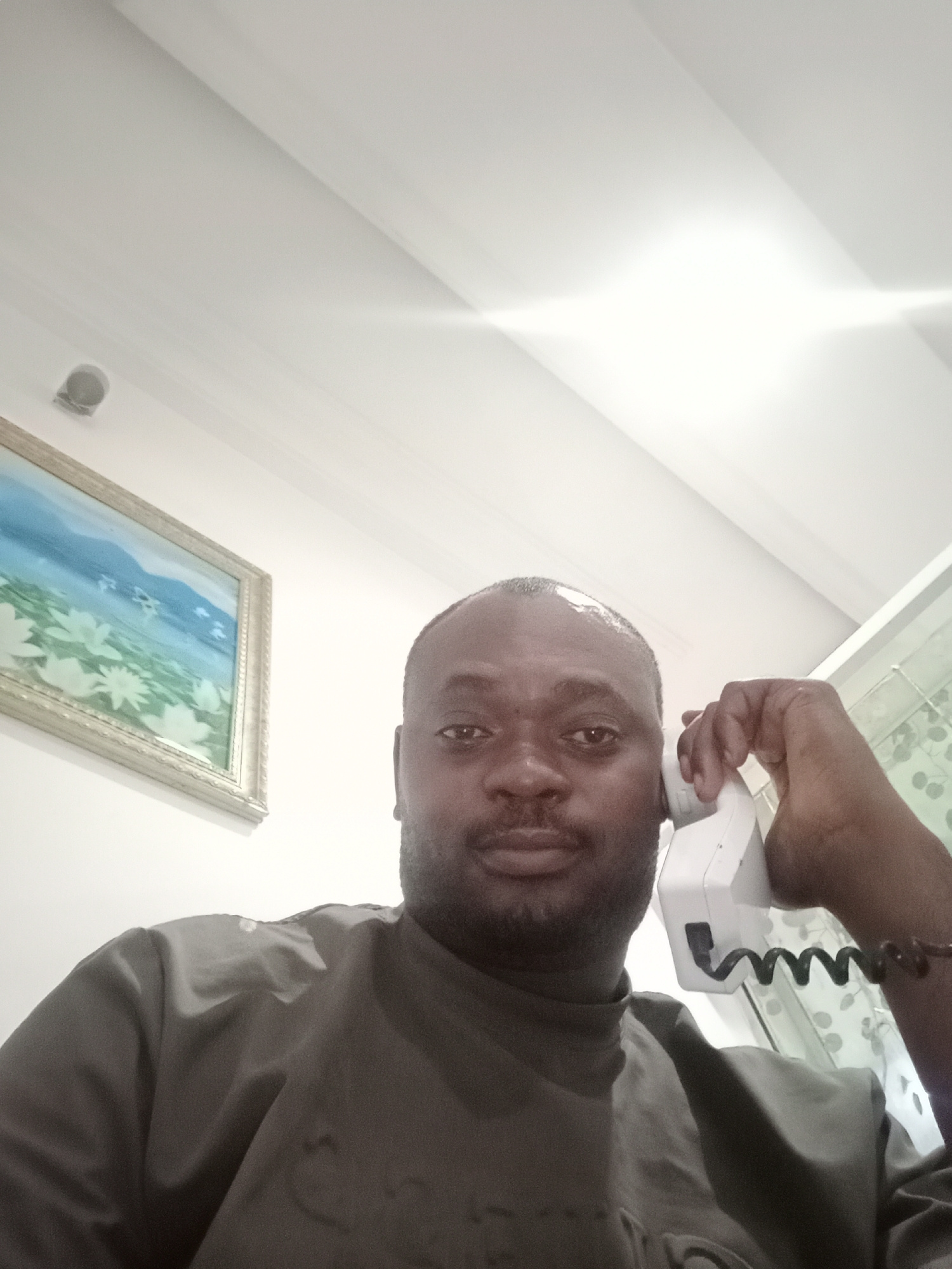 A medium shot captures a dark-skinned man in what appears to be an indoor setting. He is holding a white telephone receiver to his left ear. The man has a shaved head, a dark beard, and is wearing a d…read more