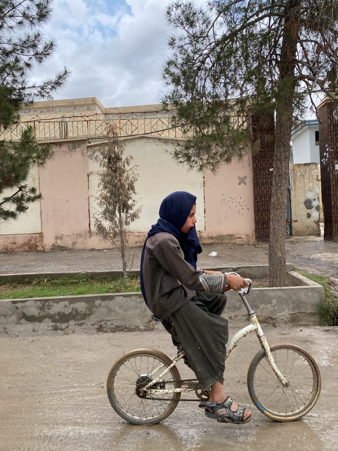 A young person is riding a bicycle on a wet street in Kandahar, Afghanistan. The individual is wearing a dark blue headscarf, a brown long-sleeved tunic, and dark pants, with sandals on their feet. Thβ¦read more