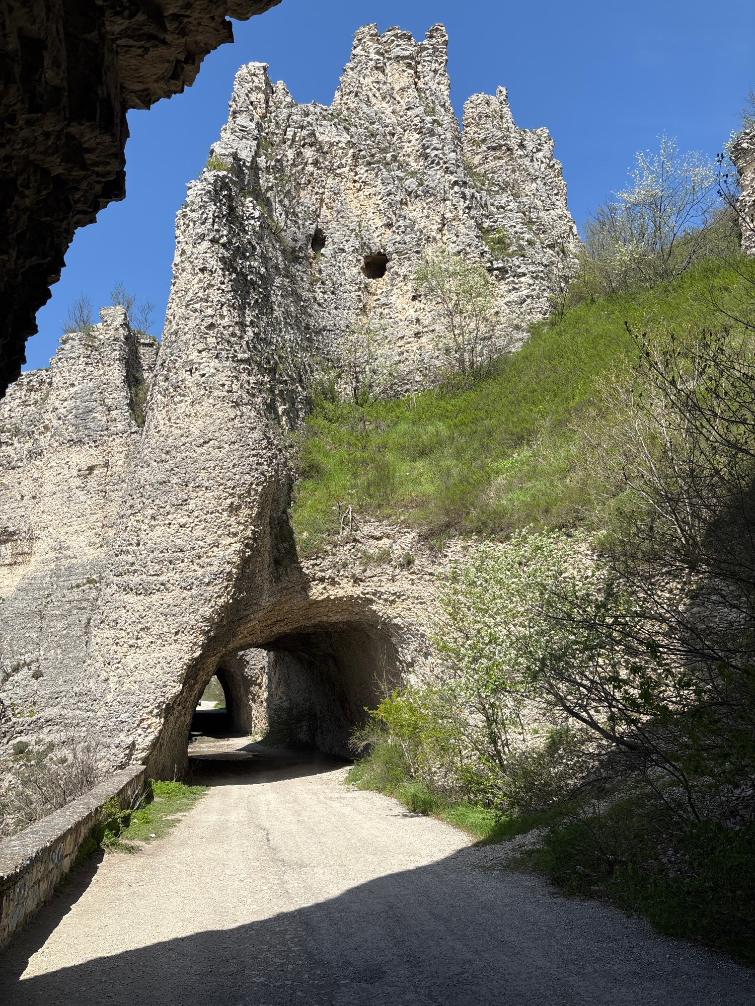 The image depicts a winding path through a dramatic, rocky landscape under a clear blue sky. The scene is dominated by towering, light-colored rock formations with a rough, jagged texture, reminiscent…read more