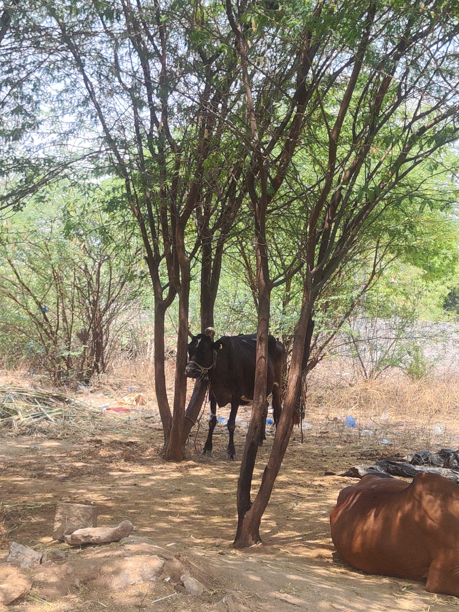 The image depicts a rural scene in Pedda Kammavaripalli, India, with a focus on the natural environment and livestock. The foreground is dominated by trees, their branches spreading across the frame.…read more