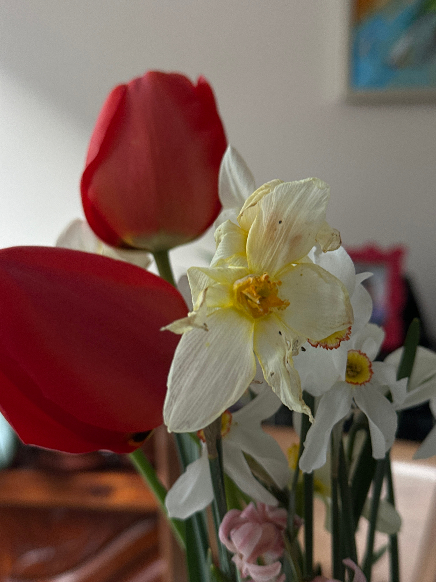 The image shows a close-up of a floral arrangement featuring red tulips and white daffodils. The daffodils exhibit some signs of aging, with slightly yellowed petals. The arrangement appears indoors,…read more