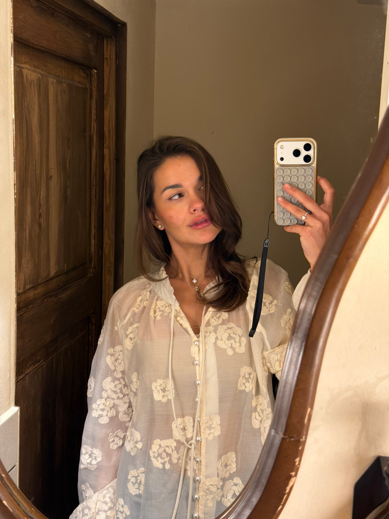 A woman is captured in a mirror selfie, showing her from the upper chest to just below the waist. She has medium-brown hair, dark eyes, and fair skin, with her head tilted and her gaze directed to her…read more