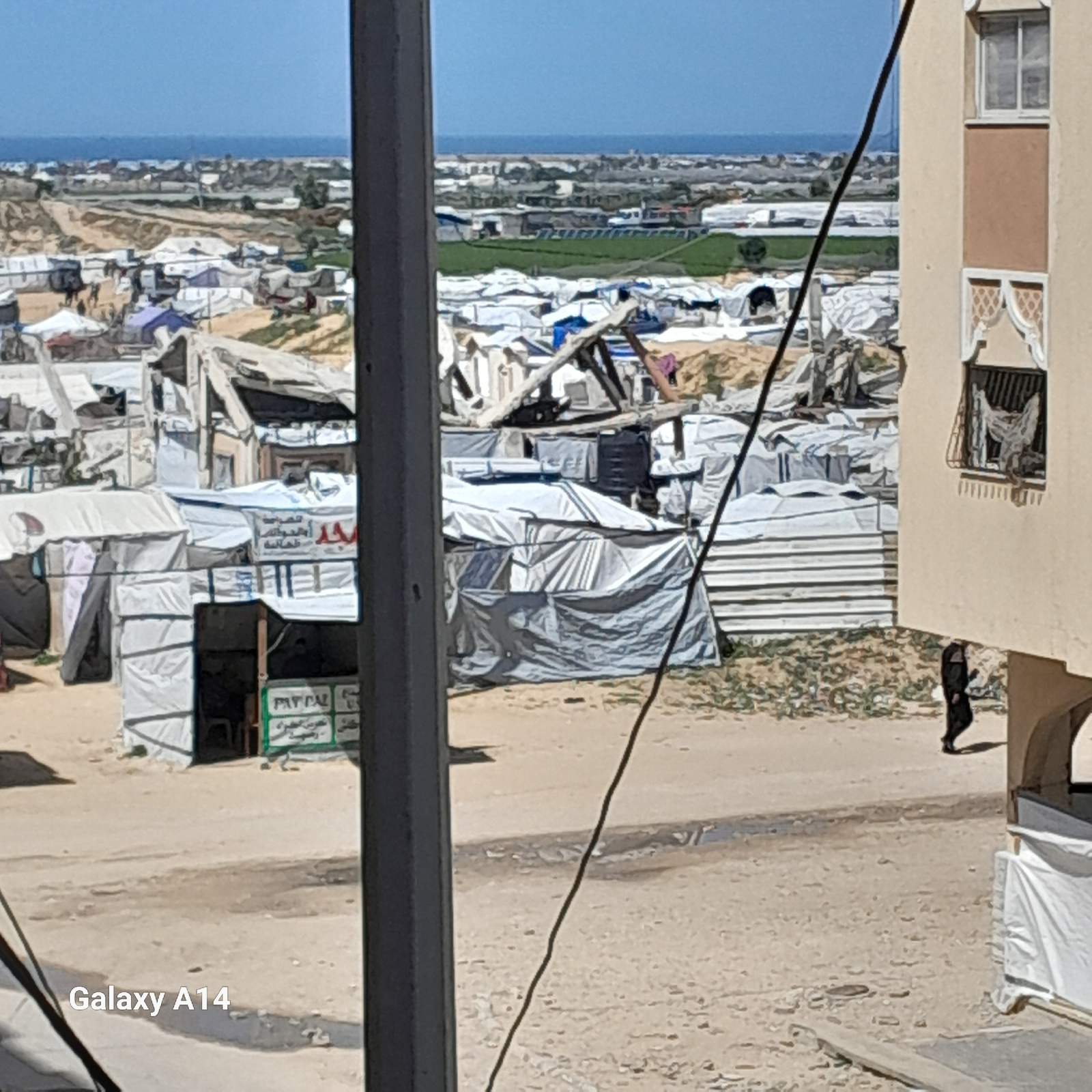 An elevated view captures an extensive informal settlement or refugee camp in Khan Yunis, Palestinian Territory, stretching towards the Mediterranean Sea visible on the distant horizon. In the immedi…read more