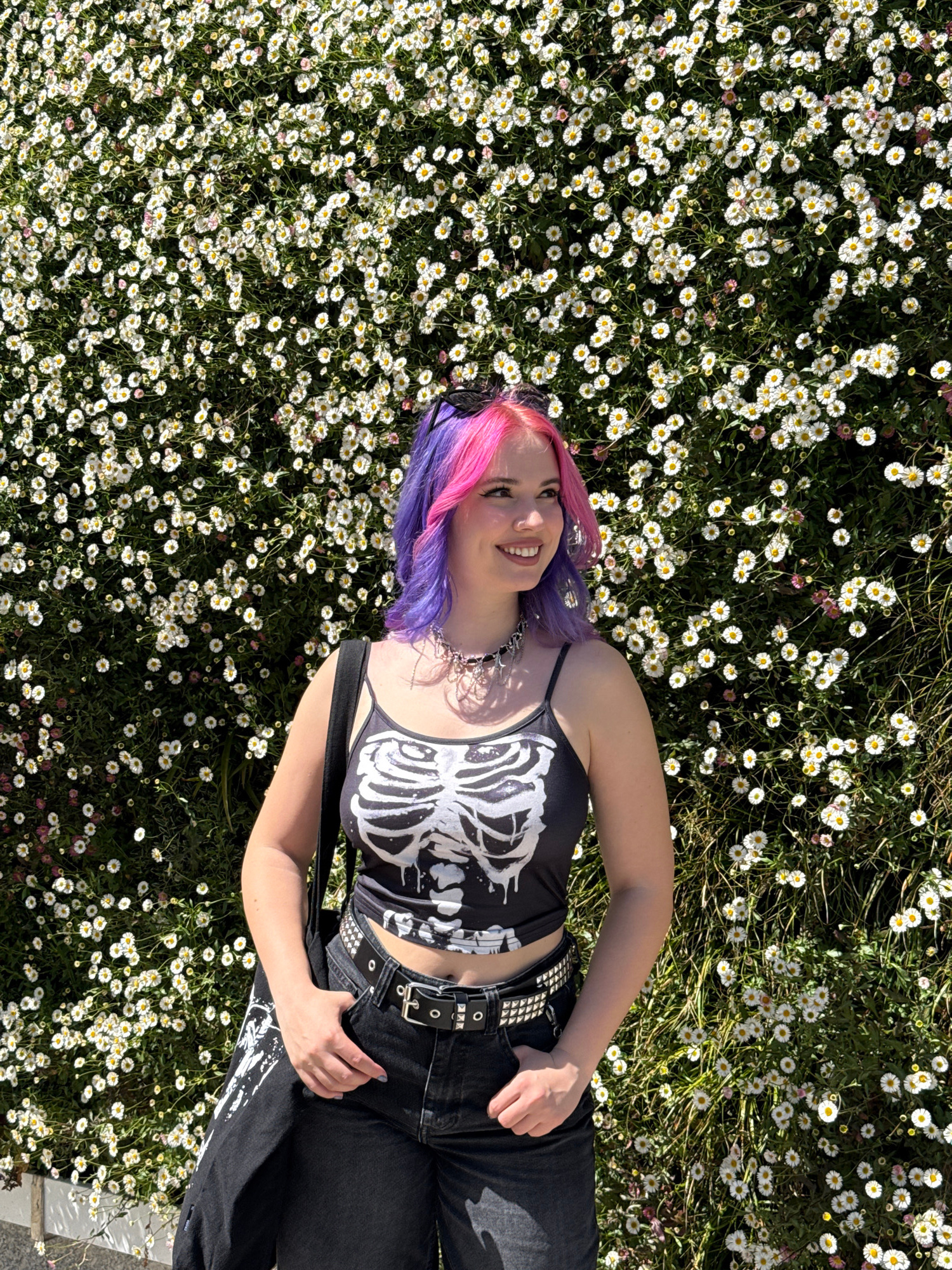 A young woman is lying in a field of small, white daisies, likely in an outdoor area. She has dyed hair in shades of pink and purple and wears a black tank top with a white skeleton rib cage design. H…read more