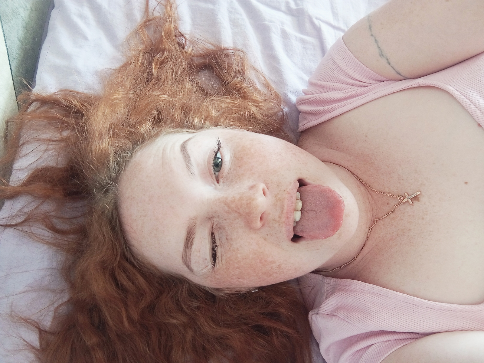 A pale-skinned woman with red, curly hair is lying on her back on a light purple bed sheet. She is winking her left eye and sticking her tongue out. Freckles are visible on her face and chest. She is…read more