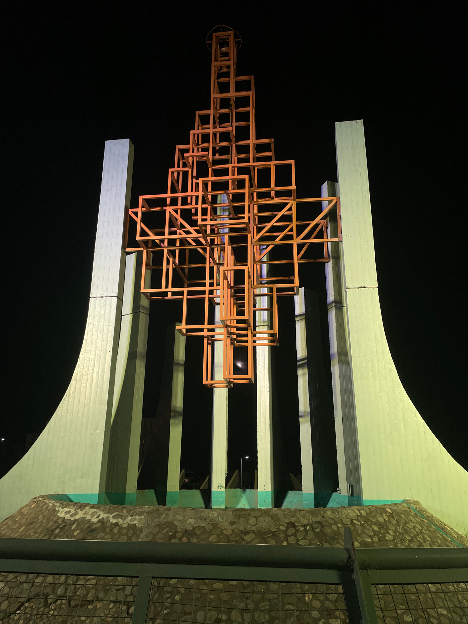 The image shows a structure illuminated at night in Ushuaia, Argentina. An orange geometric sculpture made of cube-shaped frames is suspended in the air, seemingly attached to a light-colored architec…read more
