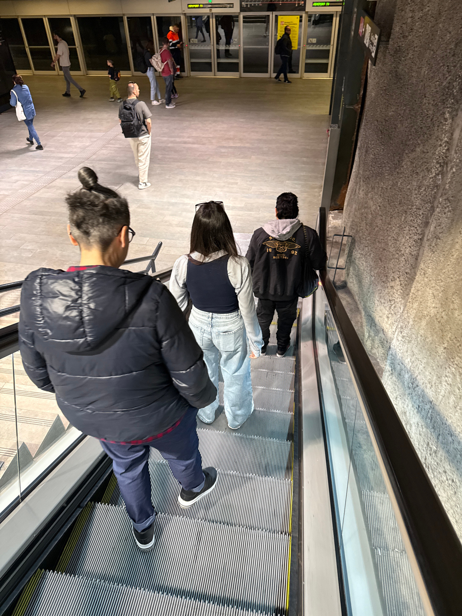 The image shows three people riding an escalator in l'Hospitalet de Llobregat, Spain. The escalator is descending. One person is wearing a dark blue puffy jacket and blue pants. Another is wearing a d…read more