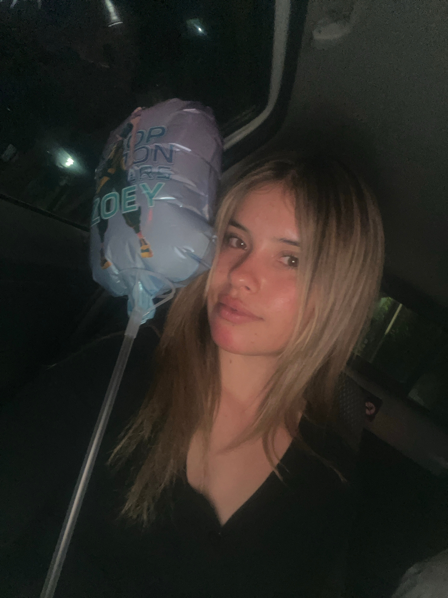A young woman with blonde hair is lying down in what appears to be the back seat of a car. She is resting her head on a partially deflated balloon that reads "Happy Birthday Joey." The location within…read more