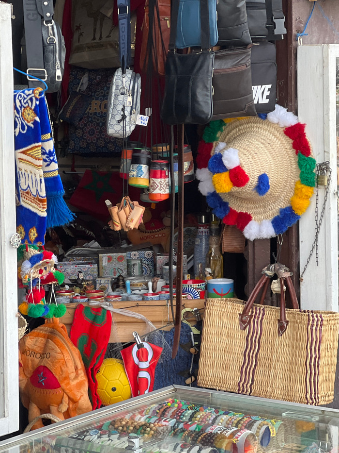 The image displays a densely stocked souvenir shop entrance in Tanger, Morocco. No individuals are visible. The shop's opening is framed by white jambs on the left, revealing a cluttered interior and…read more
