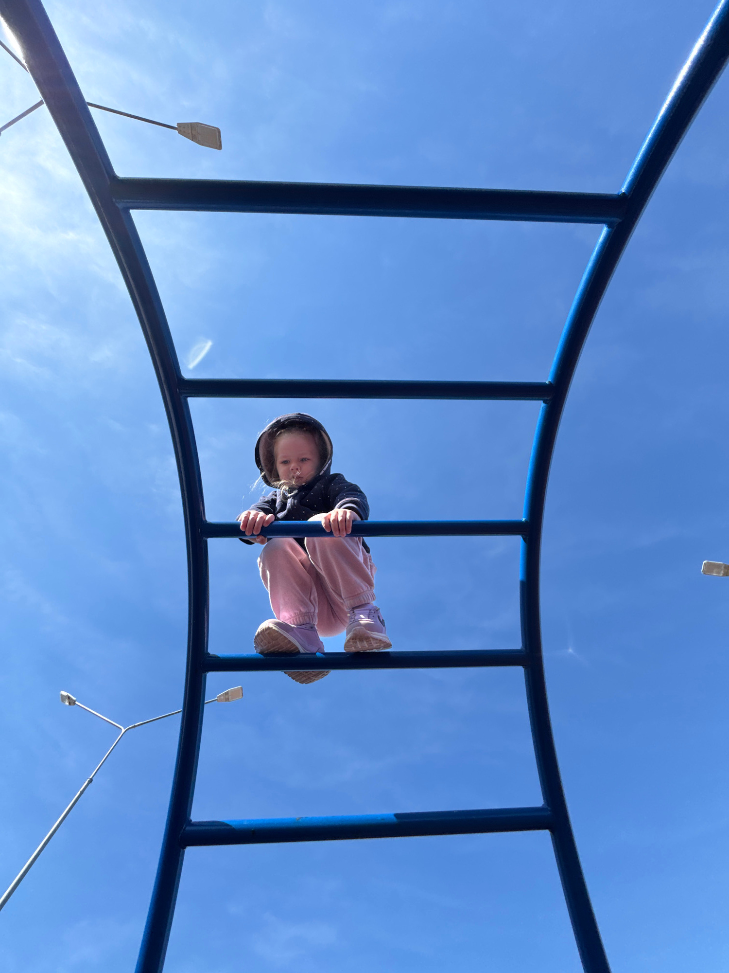 A child is hanging upside down from a blue metal jungle gym. The child is wearing a dark jacket with a hood, pink pants, and light-colored shoes. The jungle gym is set against a clear, blue sky. In th…read more