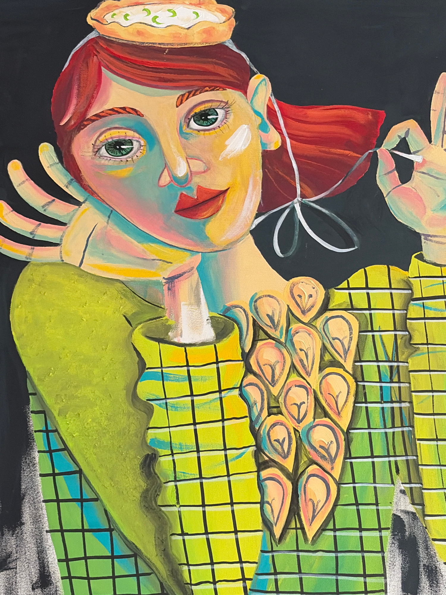 A painting depicts a whimsical character composed of various elements. The face is human-like with green eyes and red hair tied with a white ribbon, but the nose is elongated and angular. A small, rou…read more