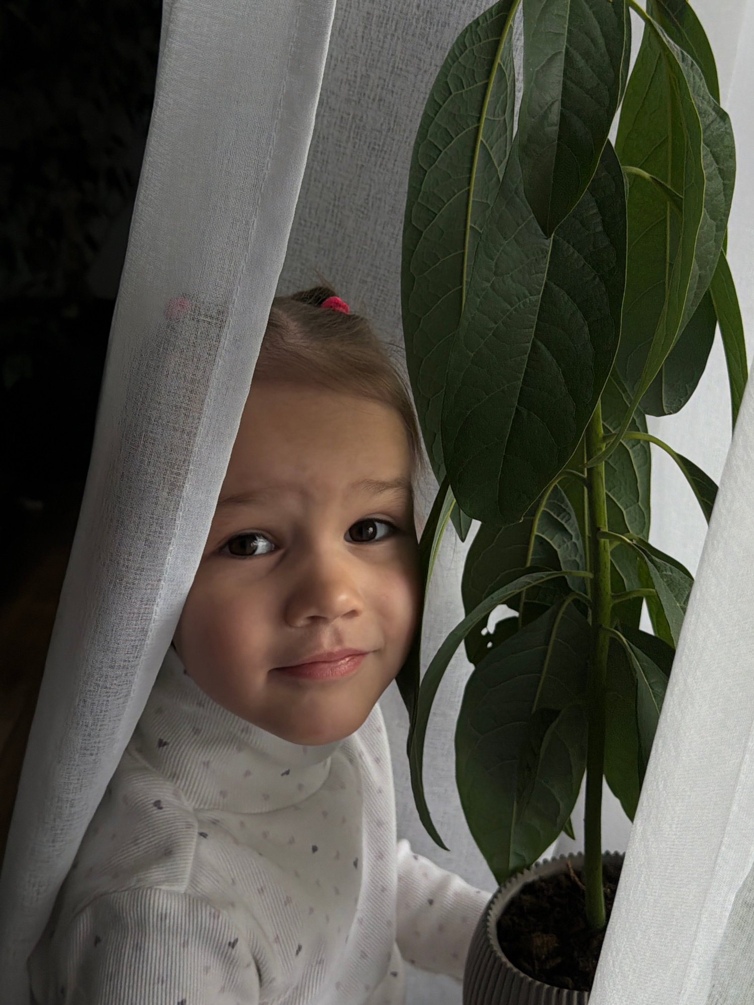 A child is lying down underneath a sheer white fabric. A potted plant with large green leaves is positioned above the child, partially obscuring the view. The child has light skin, brown eyes, and a sā¦read more