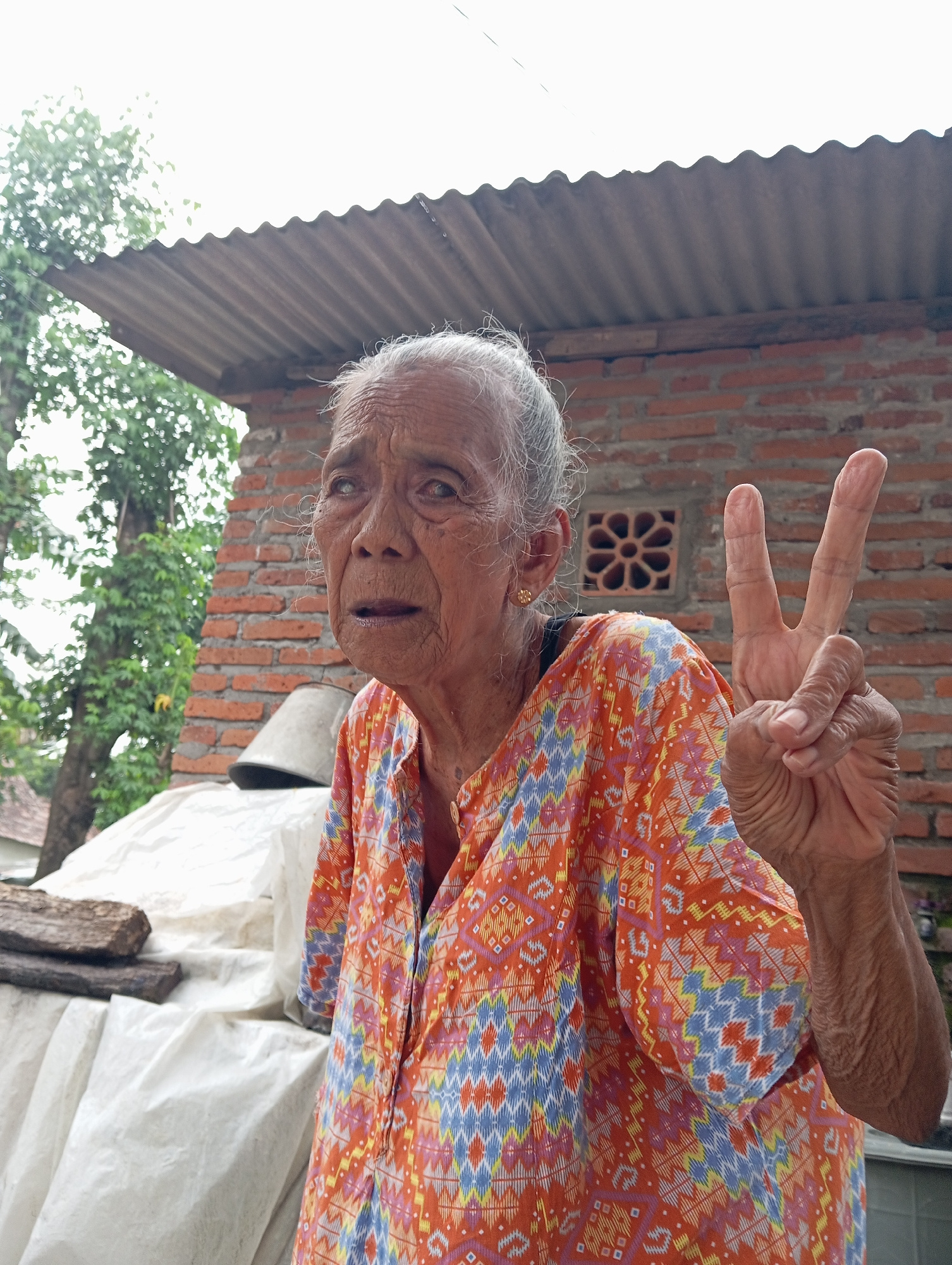 An elderly woman in Baron, Indonesia, with gray hair, stands against a brick wall under a corrugated metal roof. She is wearing an orange and blue patterned shirt and holding up her hand in a peace si…read more