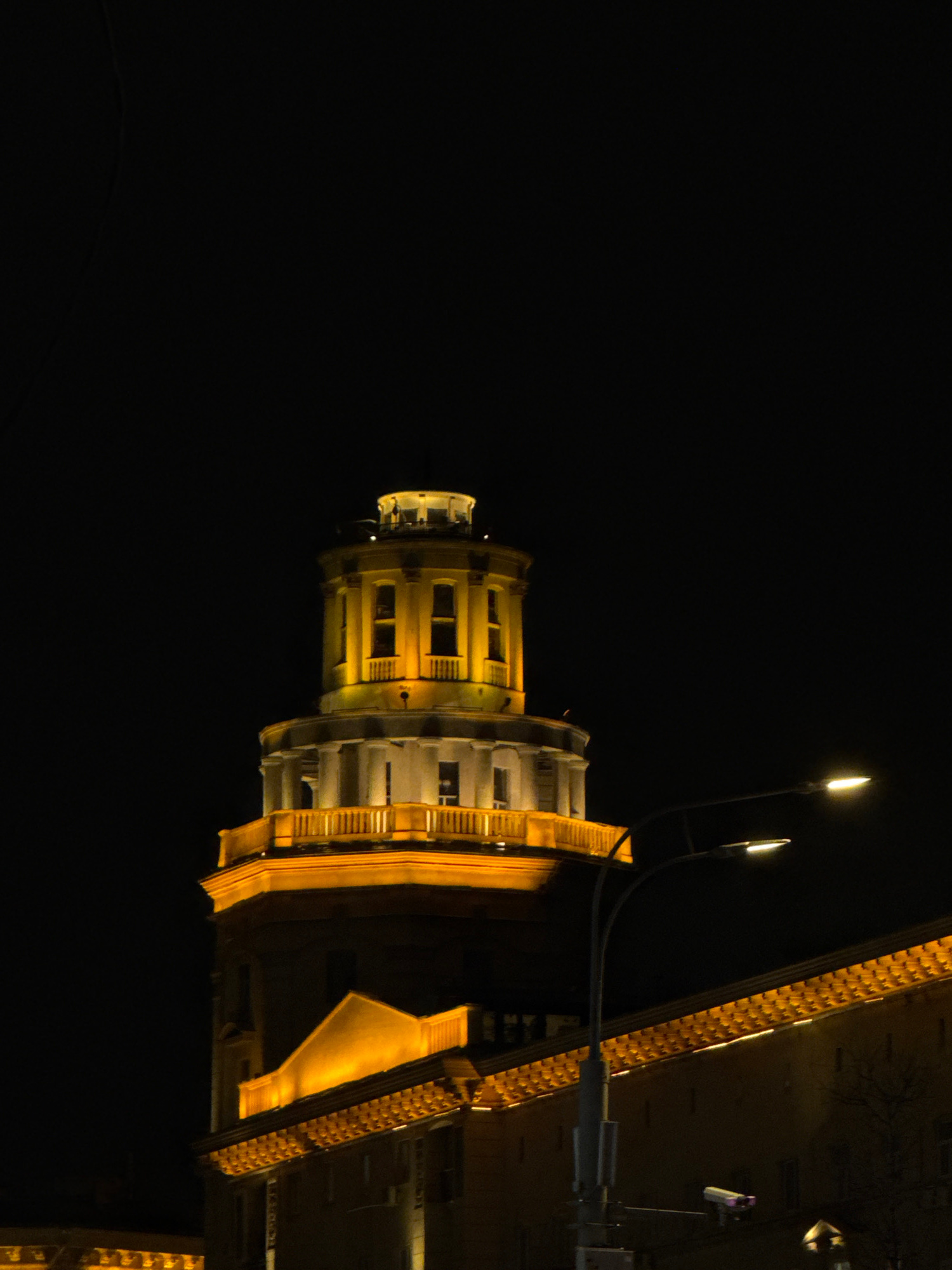The image depicts a structure illuminated at night. The structure appears to be a tower or part of a bridge, featuring a cylindrical section with windows and decorative elements. Additional structures…read more