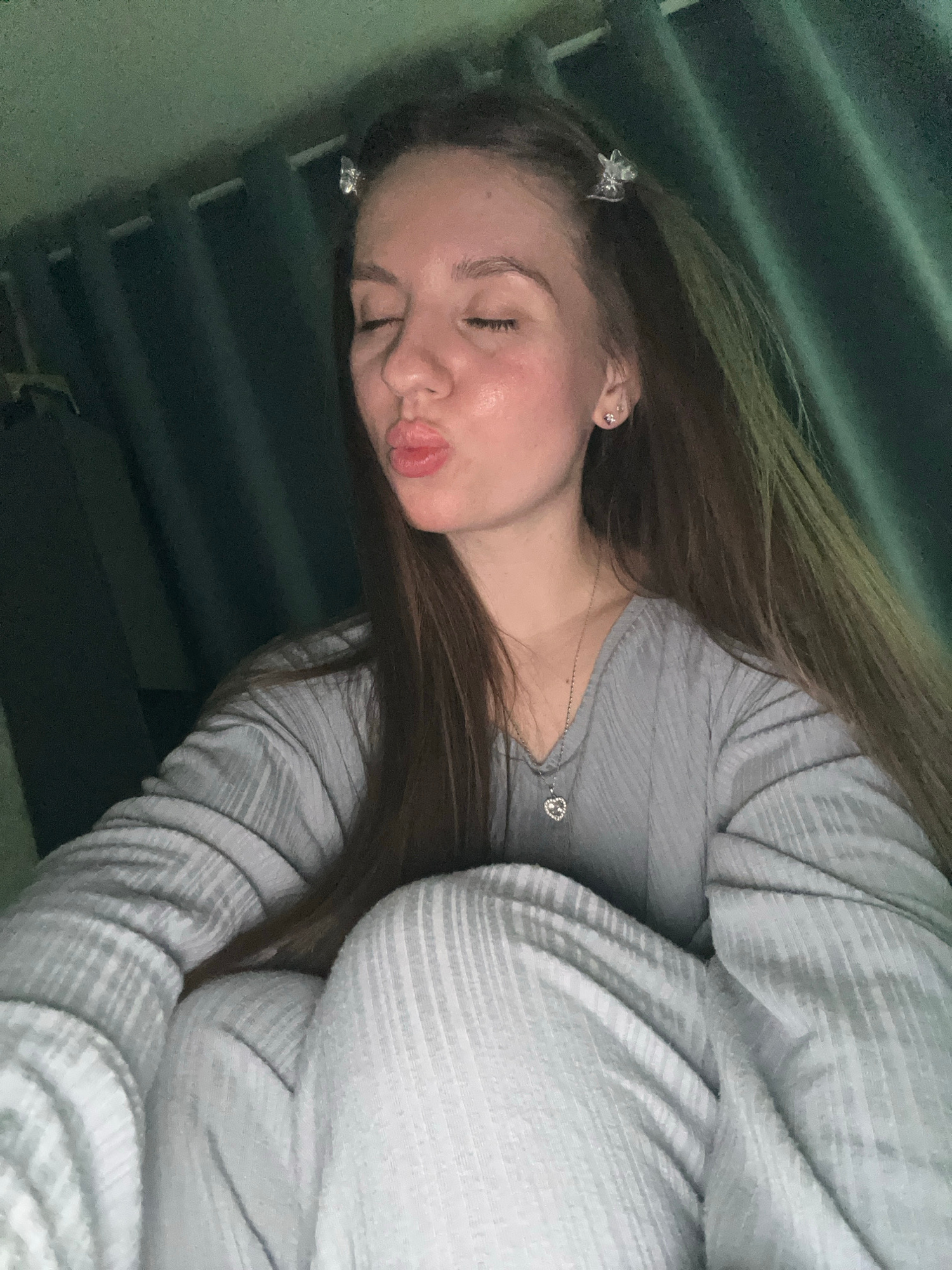 A young woman with long, straight brown hair is depicted in a diagonal, close-up shot, appearing to take a selfie. She is wearing a light gray, ribbed, long-sleeved top, and a similar textured fabric,…read more