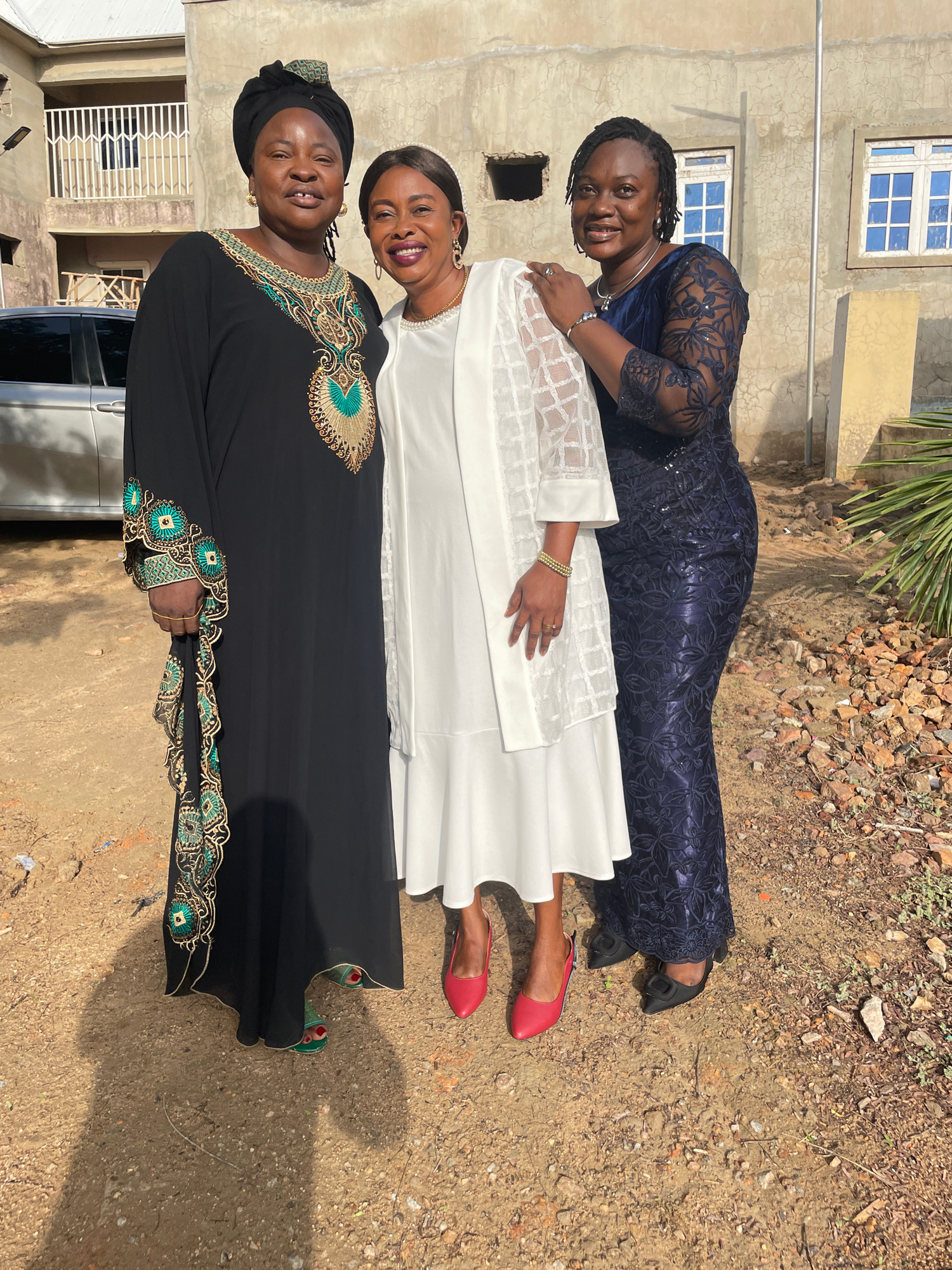 Three women are posing outdoors in Akwanga, Nigeria, on a sunny day. The woman in the foreground wears a black robe embroidered with gold and turquoise detailing, along with a dark head covering. The…read more