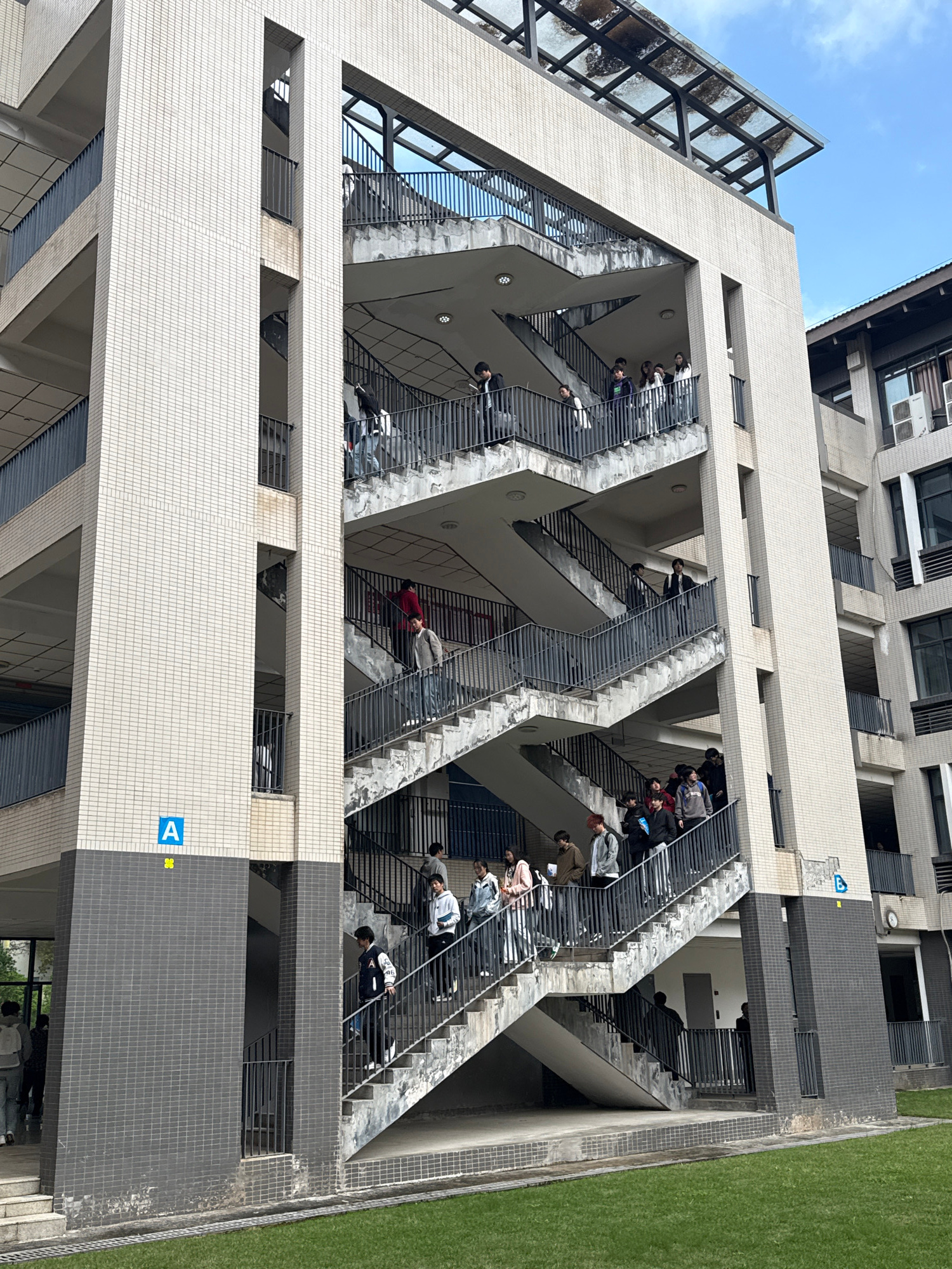 A tall, modern building dominates the frame, with an unusual exterior staircase structure. The building is light-colored, tiled in a small square pattern, and features prominent grey-colored staircase…read more