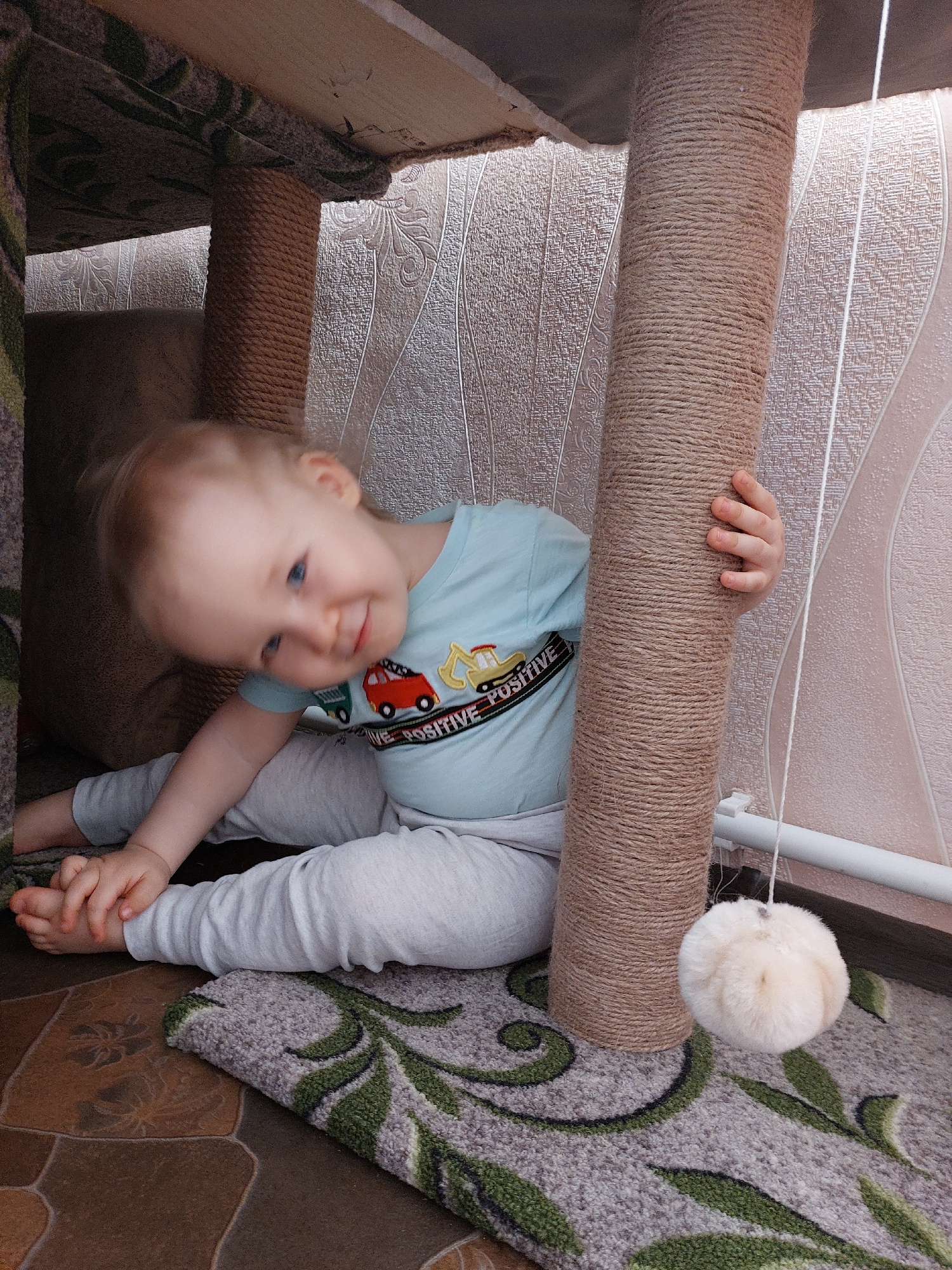 A young child with blond hair, wearing a light blue shirt with a car graphic and gray pants, is holding onto a scratching post covered in brown rope. The post has a white fuzzy ball attached to it. Th…read more