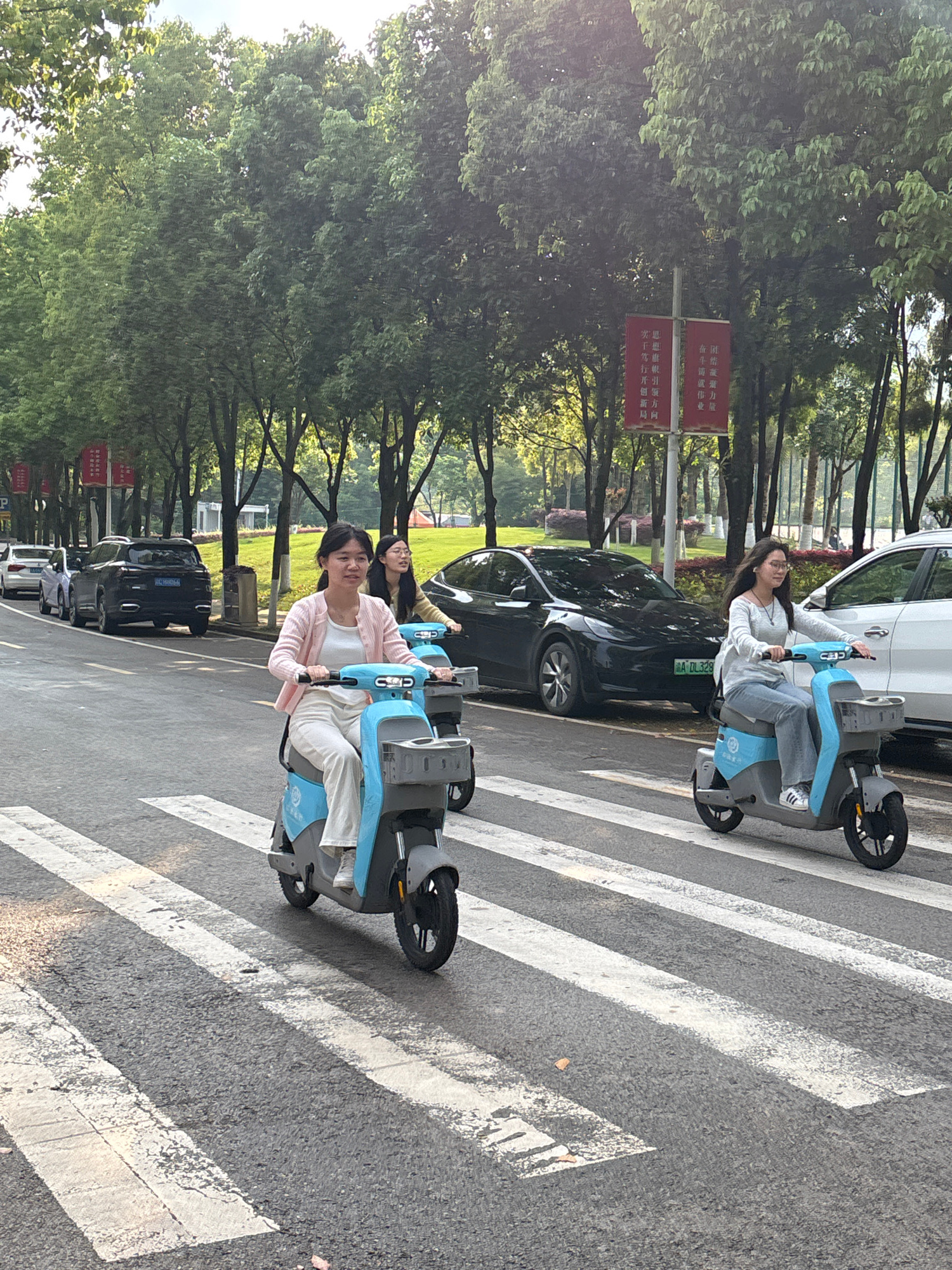 The image shows three young women riding blue-and-grey electric scooters across a zebra crossing. They are traveling in the same direction. Cars are parked along the side of the road. A red sign with…read more