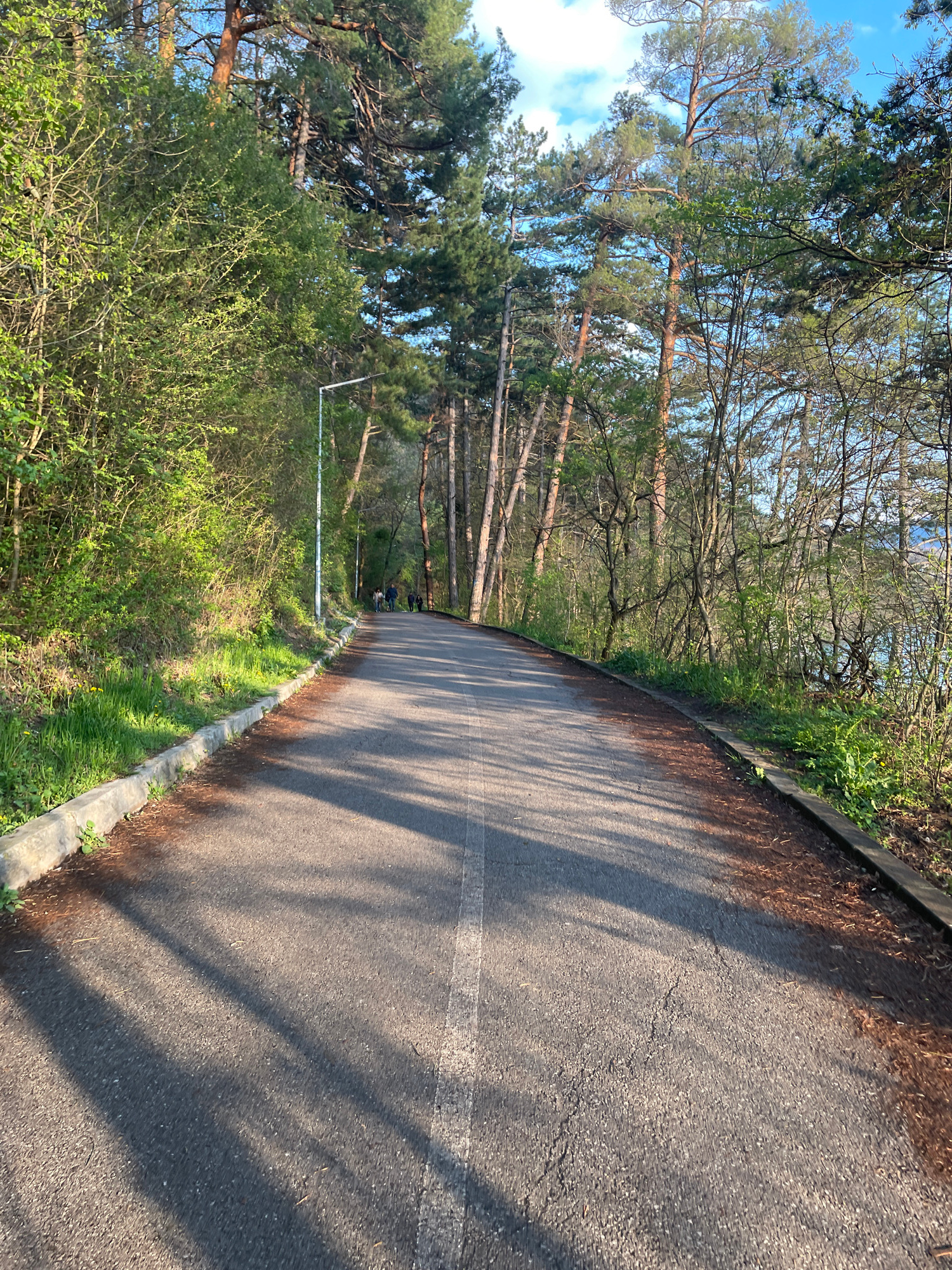 The image depicts a paved road in Pancharevo, Bulgaria, lined with trees and vegetation on one side. The road appears to be grey asphalt with shadow patterns cast by the trees. There is a concrete cur…read more