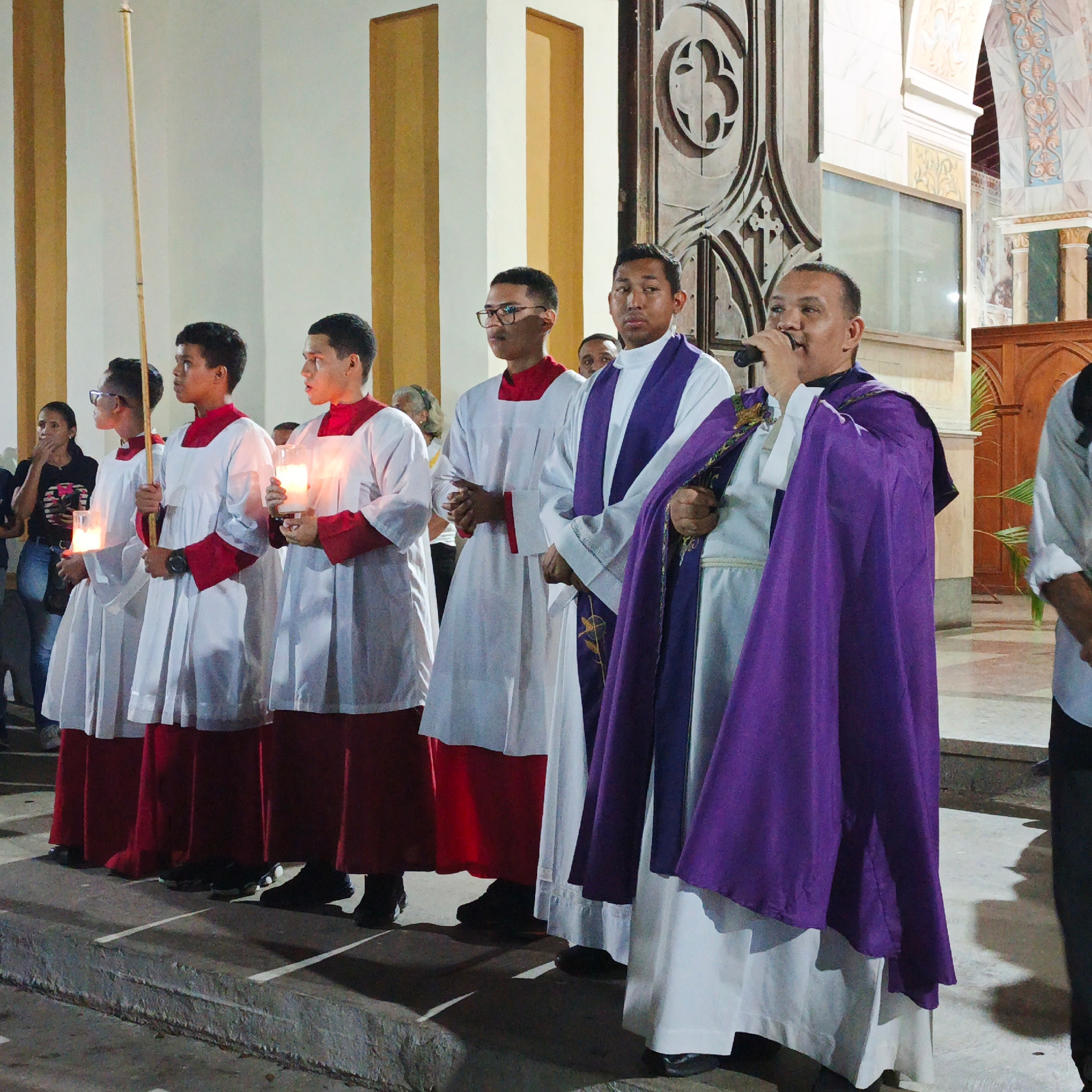 In Tinaquillo, Venezuela, a group of altar servers wearing white robes with red trim, one holding a tall bamboo rod, and one holding a lighted candle, stand on a stone platform alongside a priest who…read more