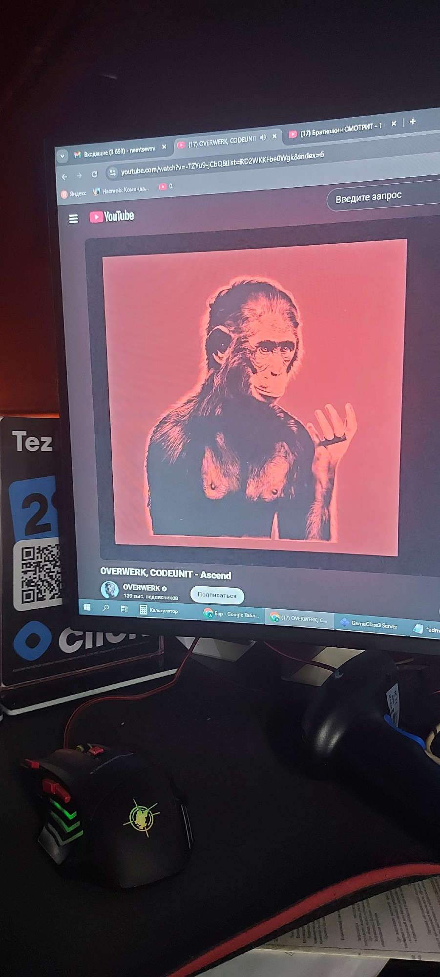 The image shows a computer screen displaying a YouTube video of "OVERWERK, CODEUNIT - Ascend," featuring an image of a chimpanzee. The web browser also has tabs open for "Входящие (3 693) - nemtsevmi"…read more