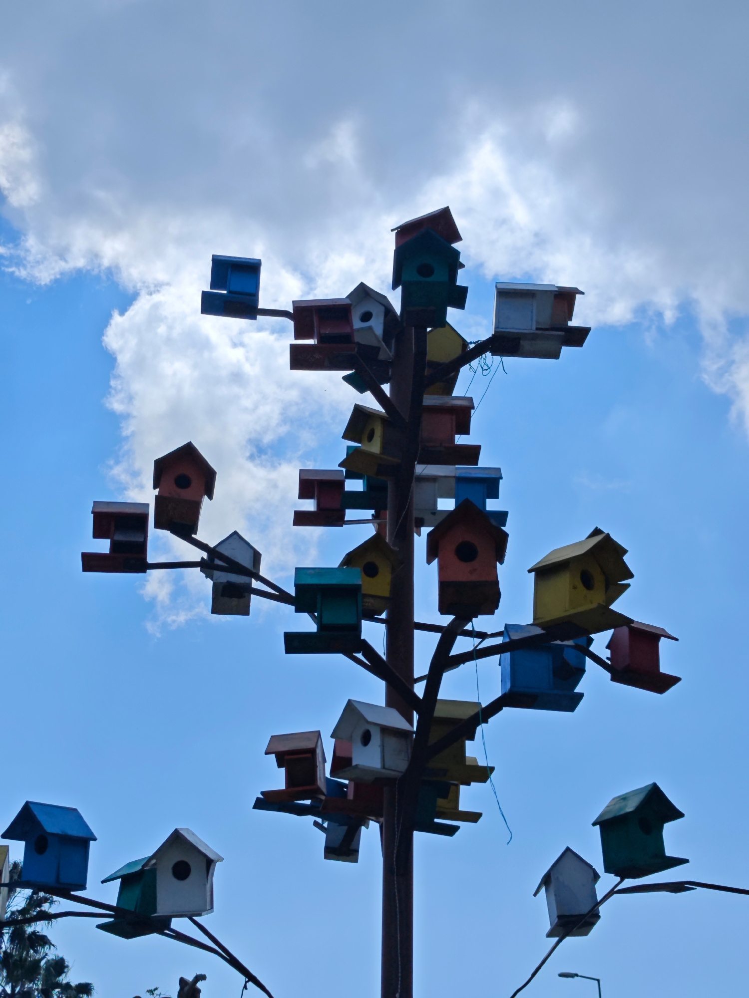 The image depicts a tall metal pole structure adorned with numerous colorful birdhouses in Finike, Turkey. The birdhouses are mounted on branches extending from the main pole, creating a tree-like app…read more