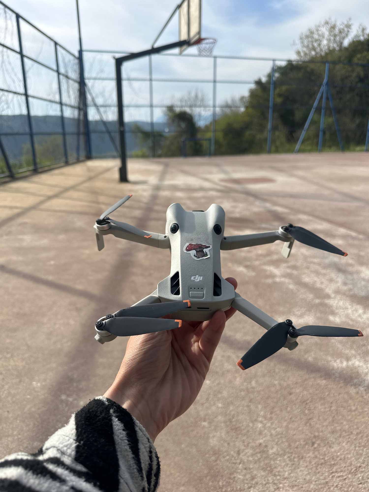 A DJI Mini 3 Pro drone is held in a person's hand, outdoors. The drone is gray with orange accents on the propellers. A sticker is adhered to the top of the drone. The person's arm is visible, clothed…read more