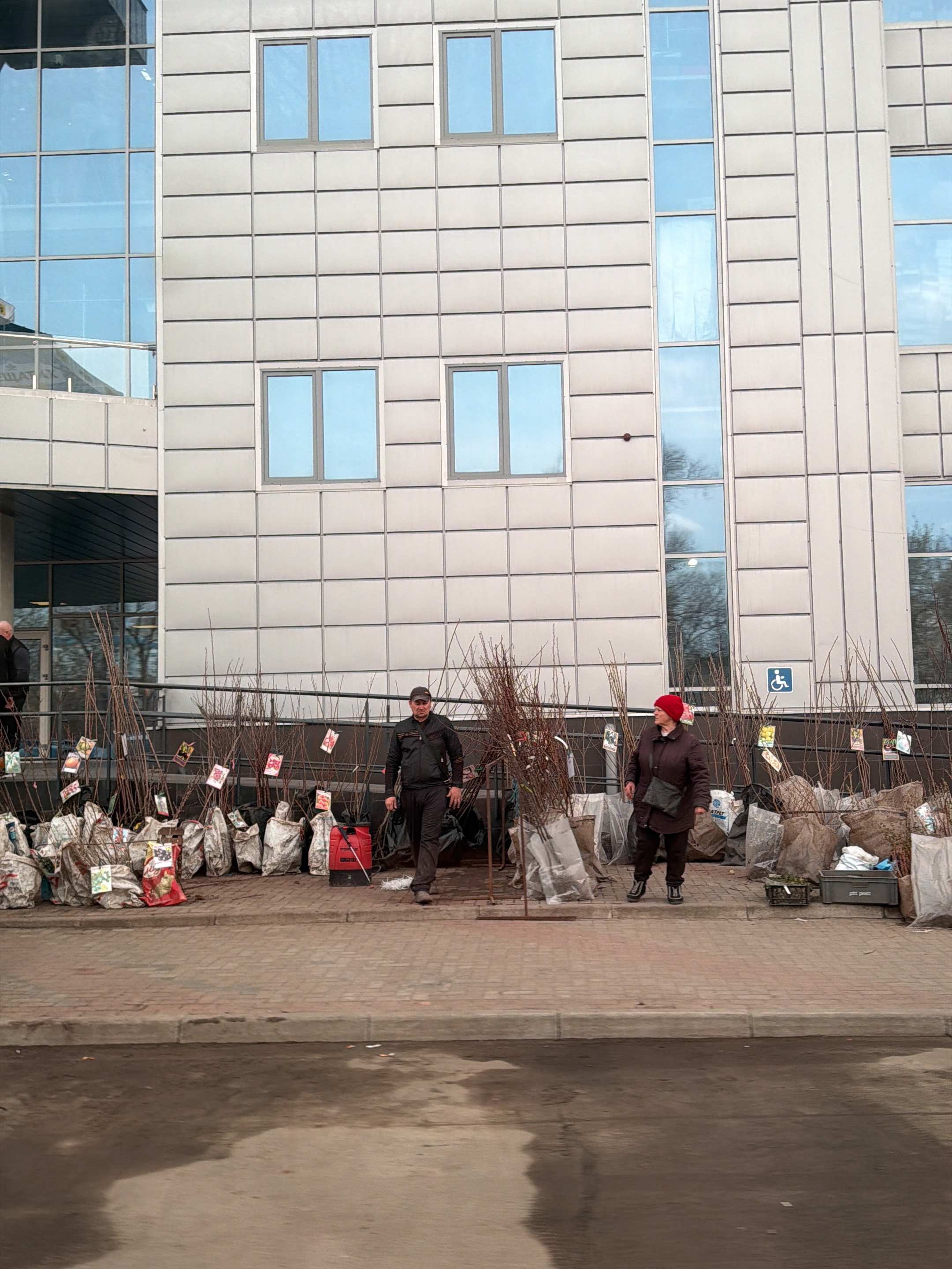 The image depicts an outdoor scene in Sumy, Ukraine. A collection of small trees, likely saplings, are displayed for sale along a sidewalk in front of a multi-story building with large, grid-patterned…read more