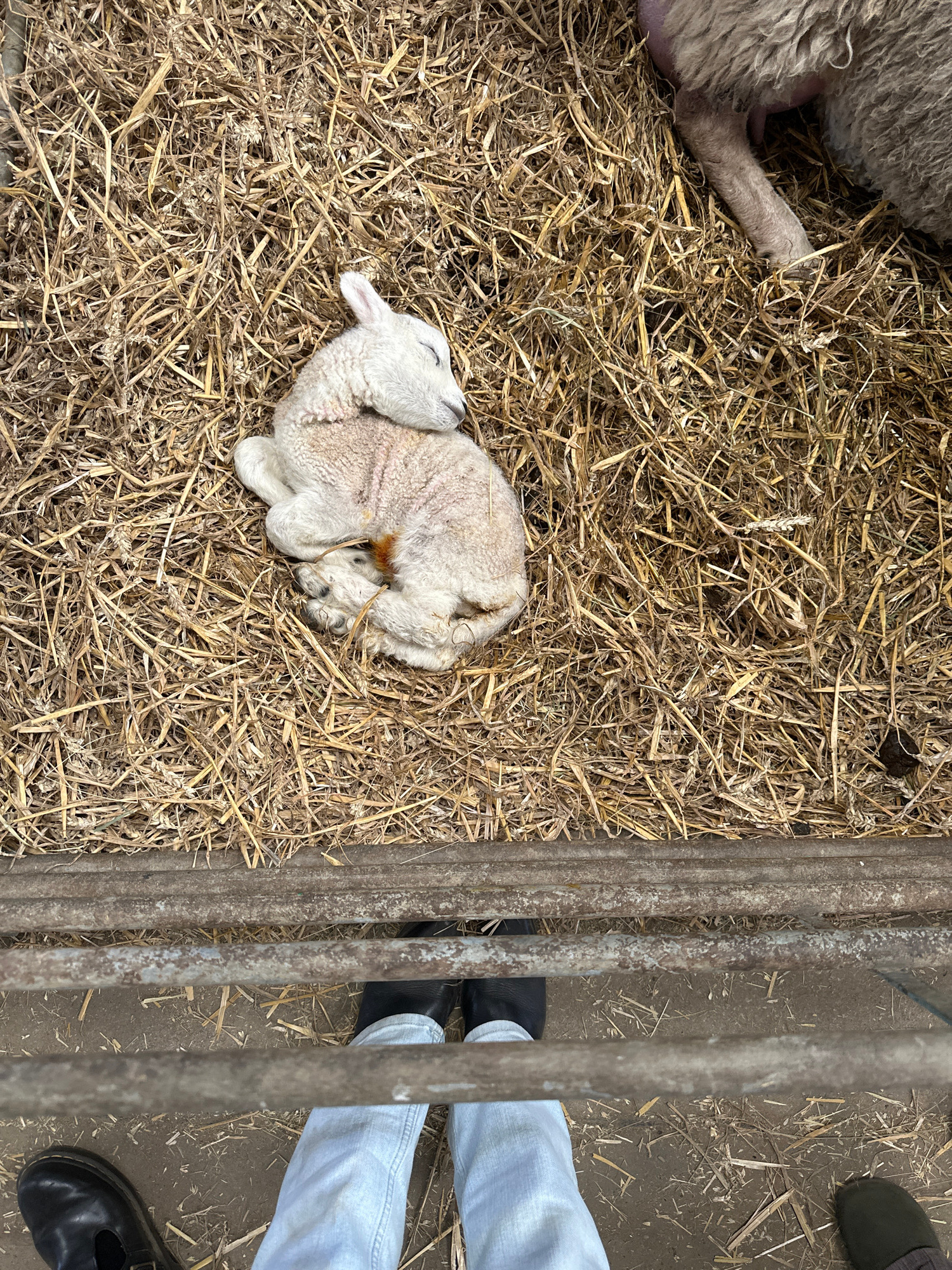 An overhead shot depicts a lamb curled up on a bed of straw inside a pen in Sevenoaks, UK. A section of the pen's metal bars is visible on the right side. Partially visible near the top-left corner is…read more