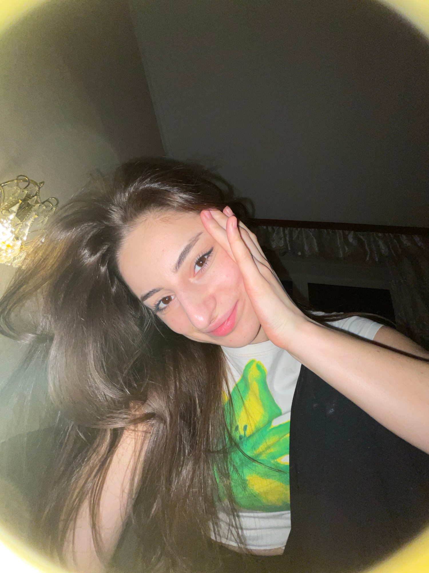 A woman lies with her head near a chandelier. She is wearing a white t-shirt with a large green and yellow design and a black top. Her left hand is on her forehead. The location is unknown and there i…read more