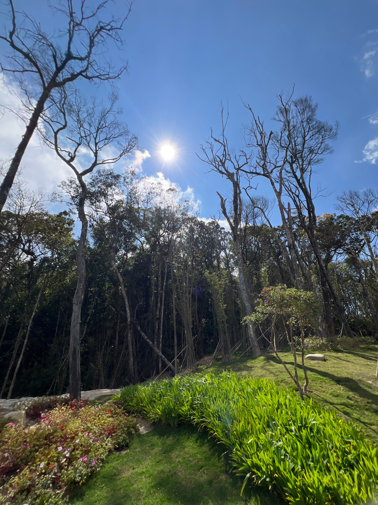 This image captures a bright, sunny outdoor scene in Unknown, Vietnam, featuring a combination of natural forest and cultivated landscaping. The upper half is dominated by a clear blue sky with scatte…read more