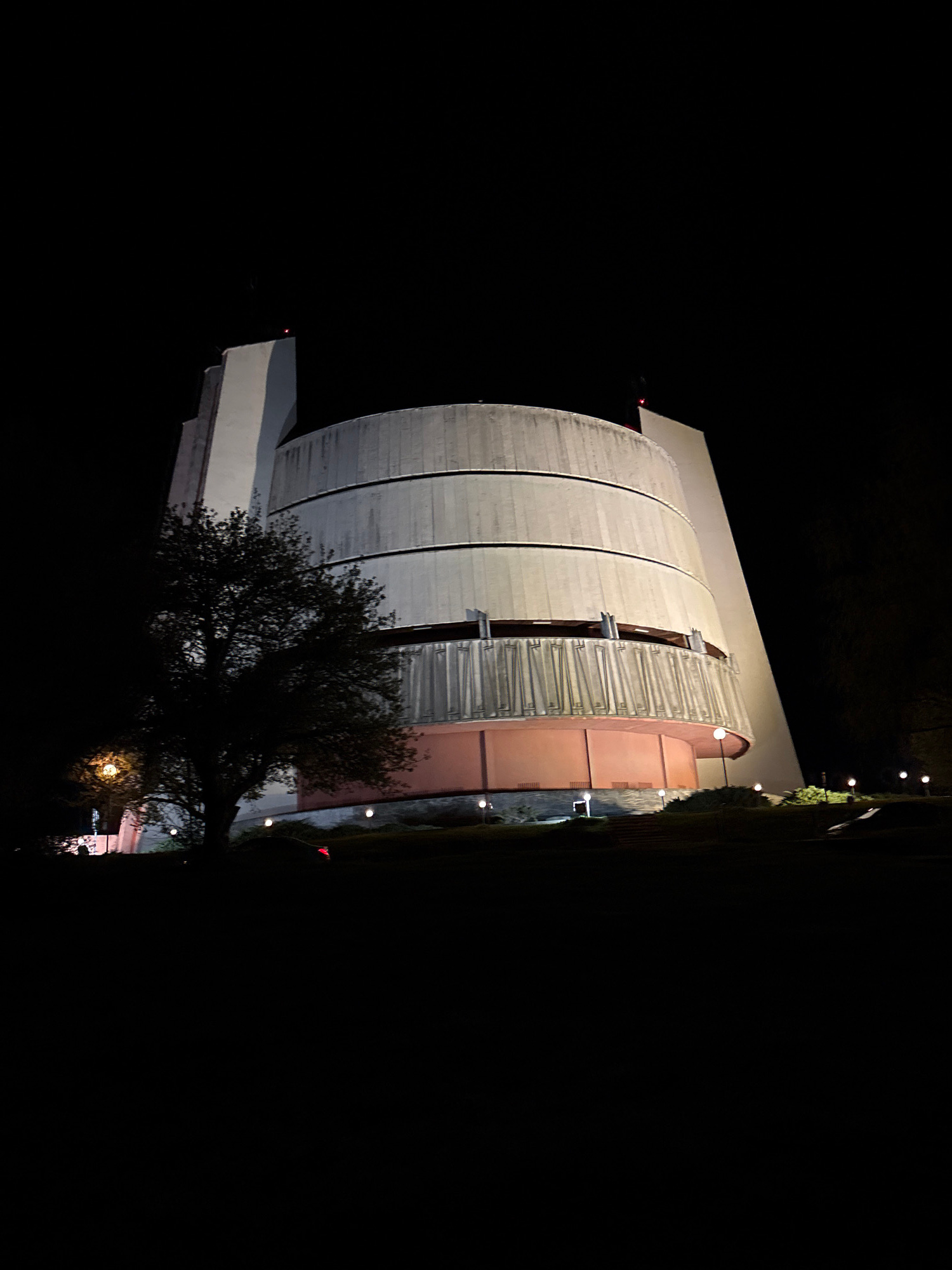 At night, a view of Pleven Panorama in Pleven, Bulgaria, shows its architectural structure. The main feature is a semi-circular building with vertical panels, some sections with ladder-like structures…read more
