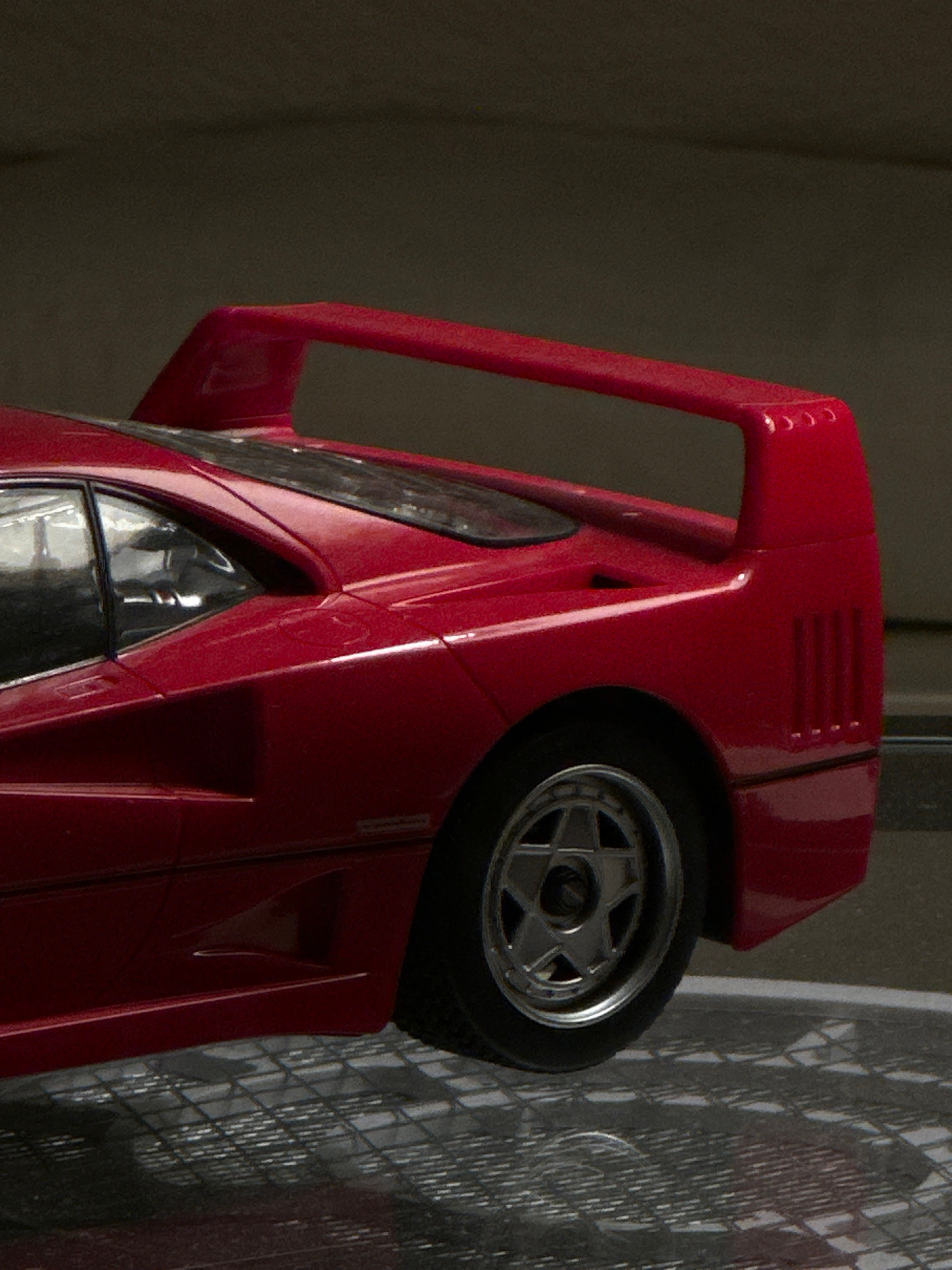 A close-up shot presents a red Ferrari F40 toy car. The wheel of the car is visible. It is unclear where exactly in Milan, Italy this picture was taken.