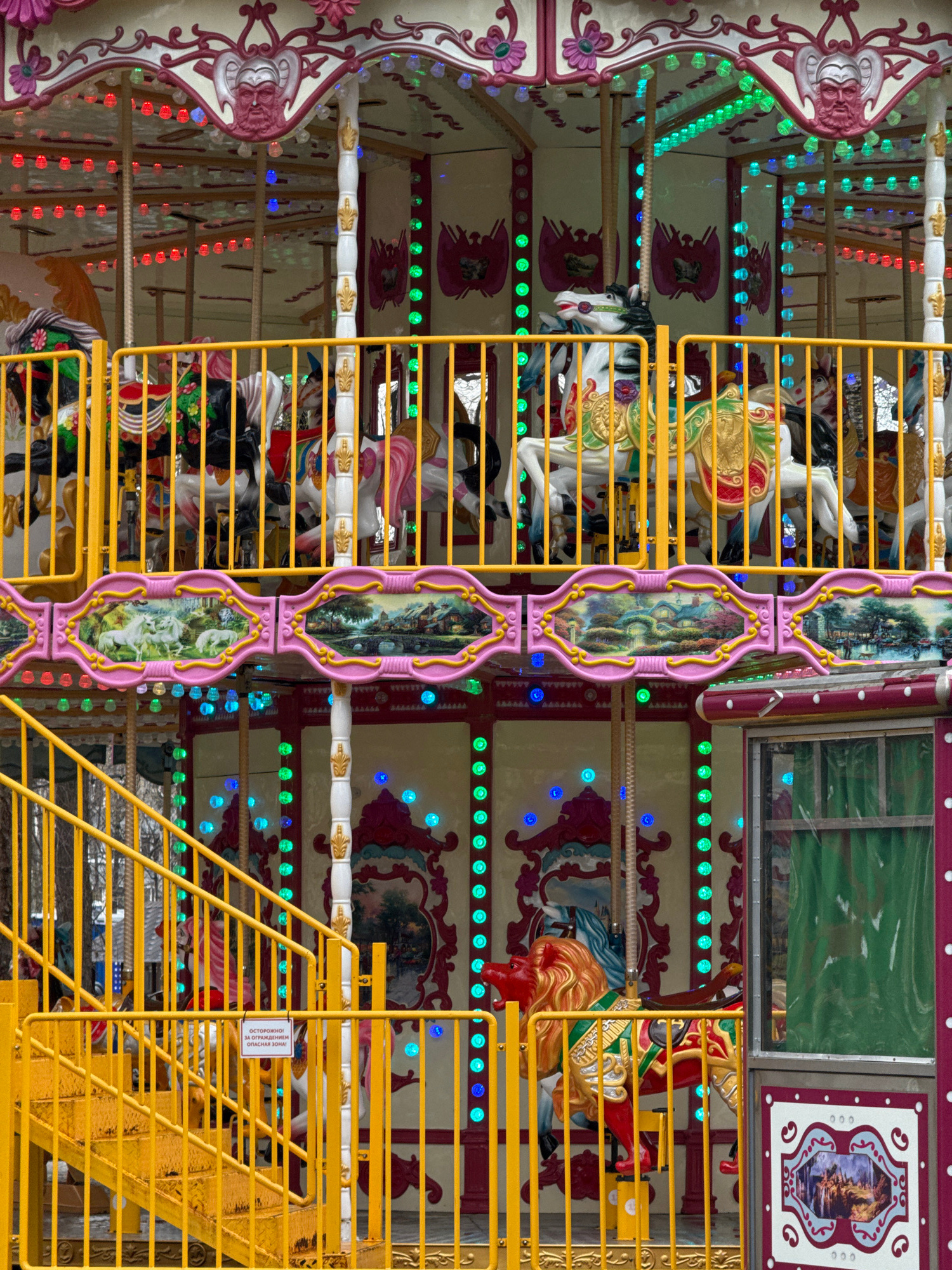This media file captures a vibrant, multi-level carousel, viewed from an elevated perspective. The carousel is richly adorned with intricate decorations, colorful paintings, and festive lighting, char…read more