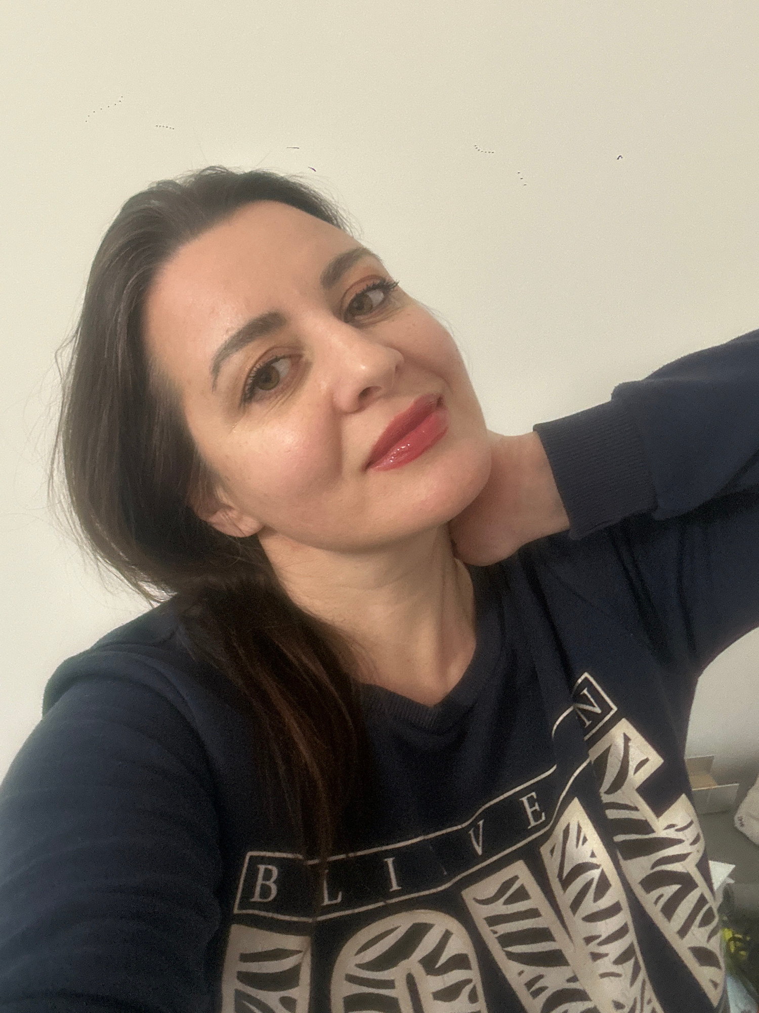 A selfie shows a woman with brown hair, brown eyes, and reddish lipstick, wearing a dark blue long-sleeved shirt with a graphic design that includes the word "BELIEVE." The background appears to be aβ¦read more
