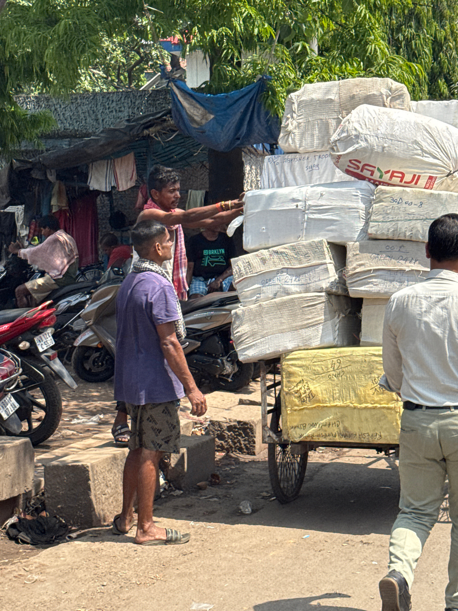 The image captures a street scene in Kolkata, India. A man in a white shirt and light-colored pants stands near a heavily loaded cart. The cart is filled with large sacks, some labeled "SAYAJI", "ABHI…read more