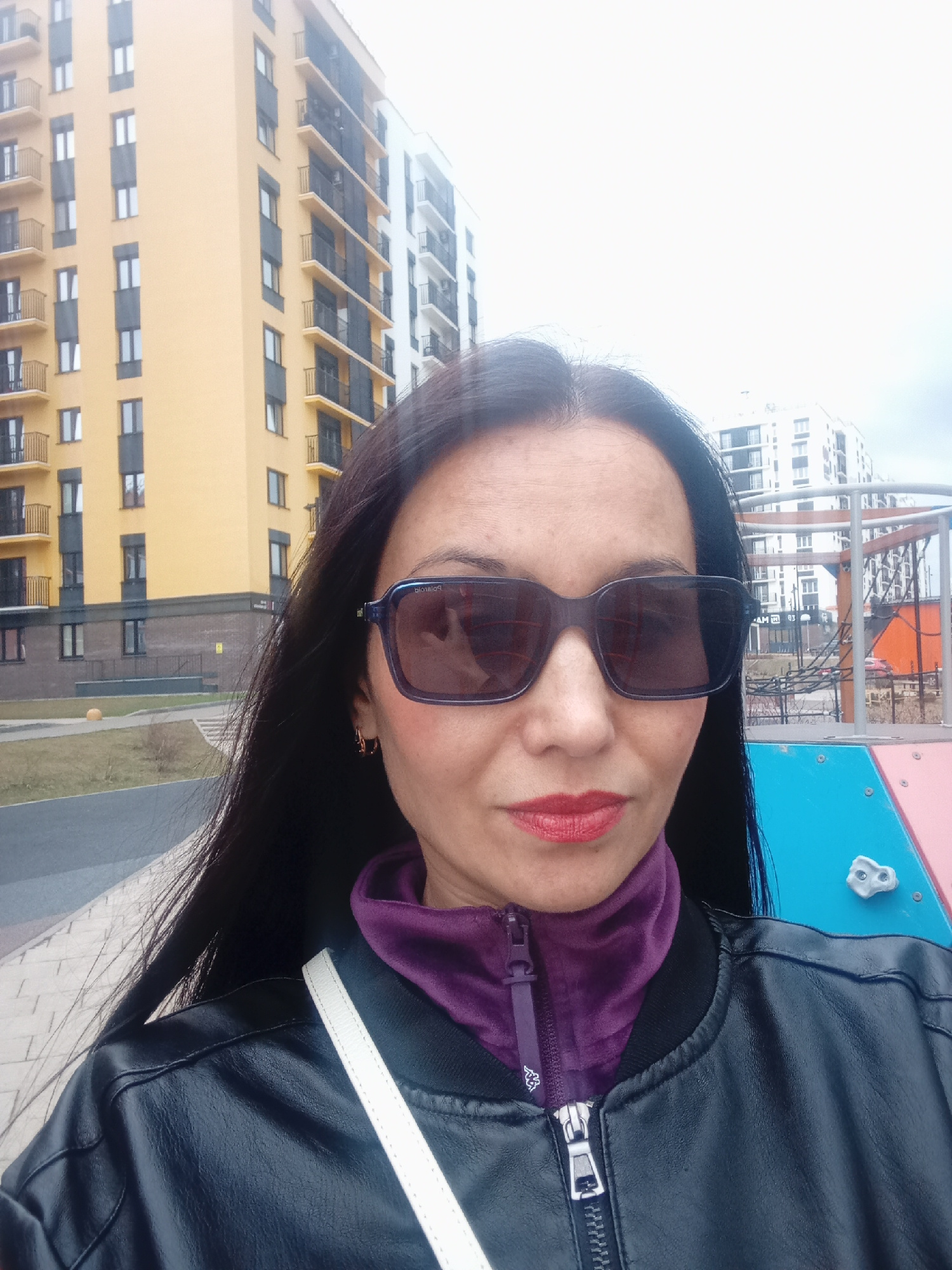 A woman with dark hair is taking a selfie outdoors in what appears to be a city park. She is wearing sunglasses, a black leather jacket with a purple velvet collar, and earrings. She has a white strap…read more